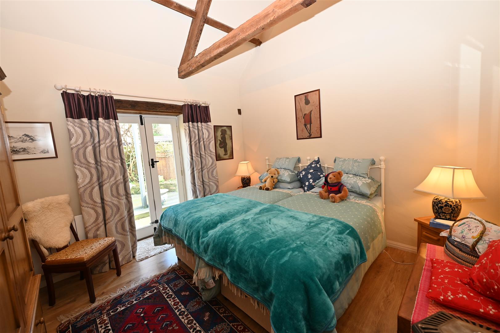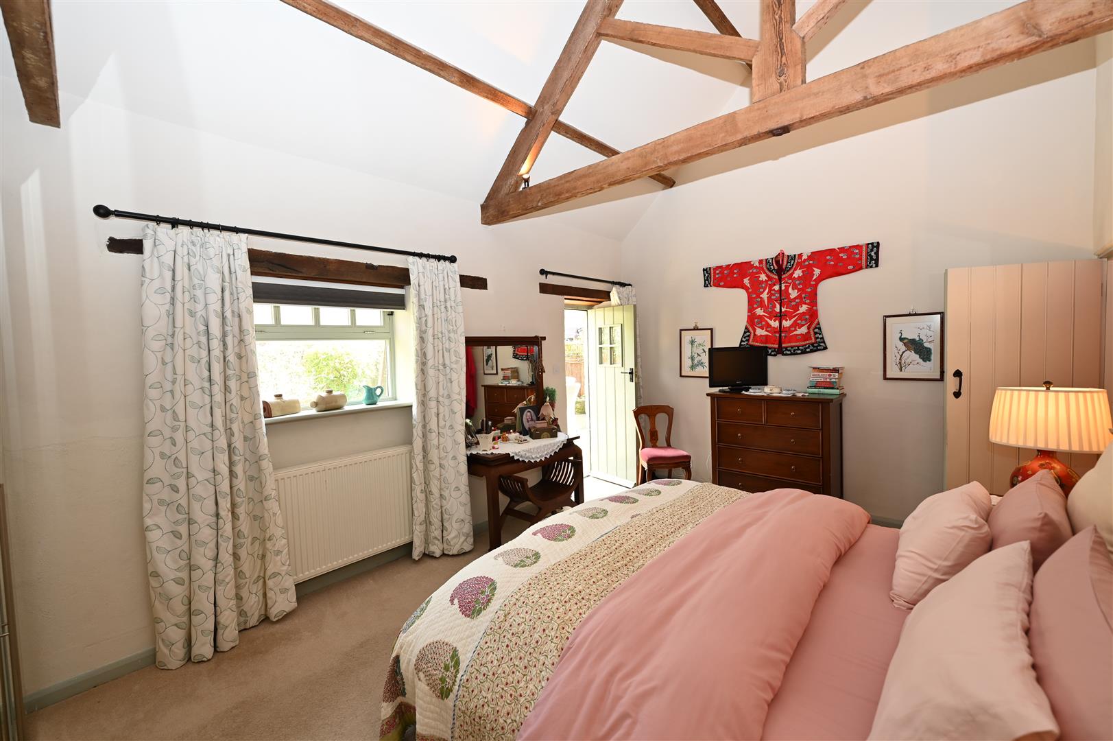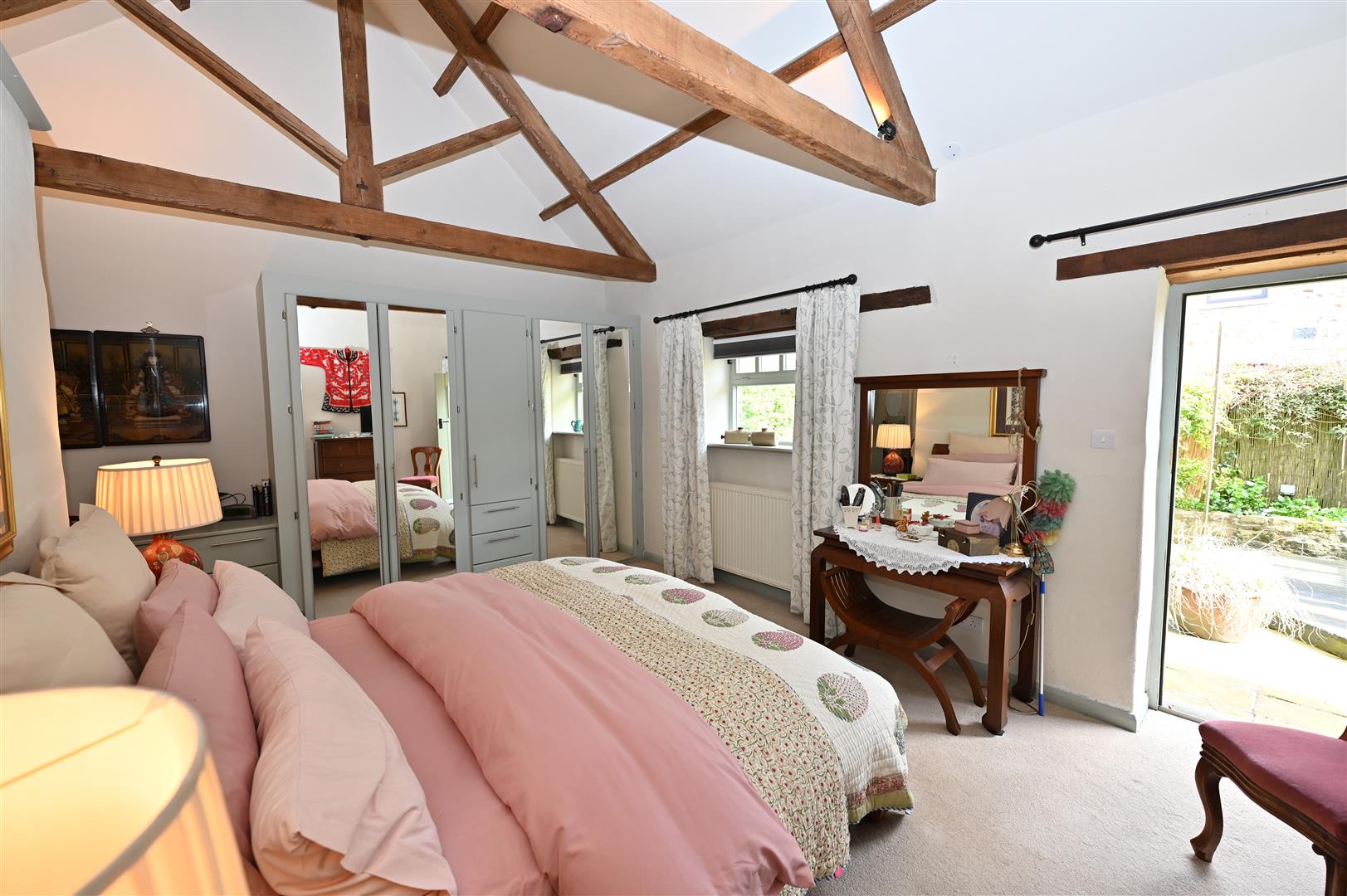 .Vaulted truss ceiling & Oak flooring. Double doors opening into the patio garden.
