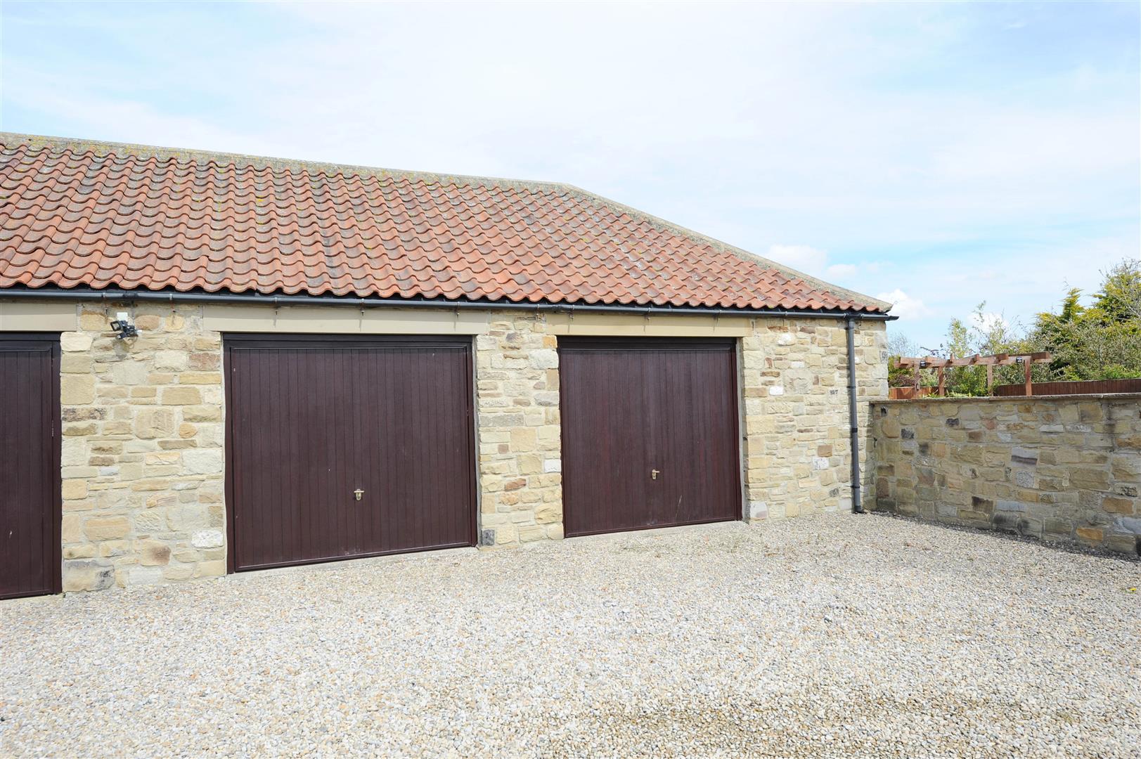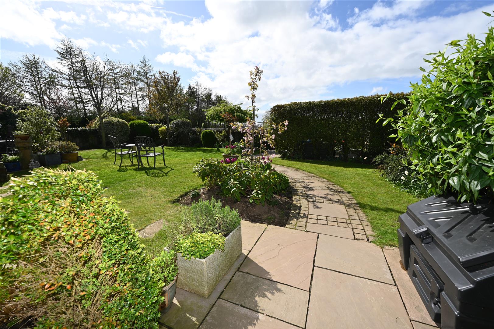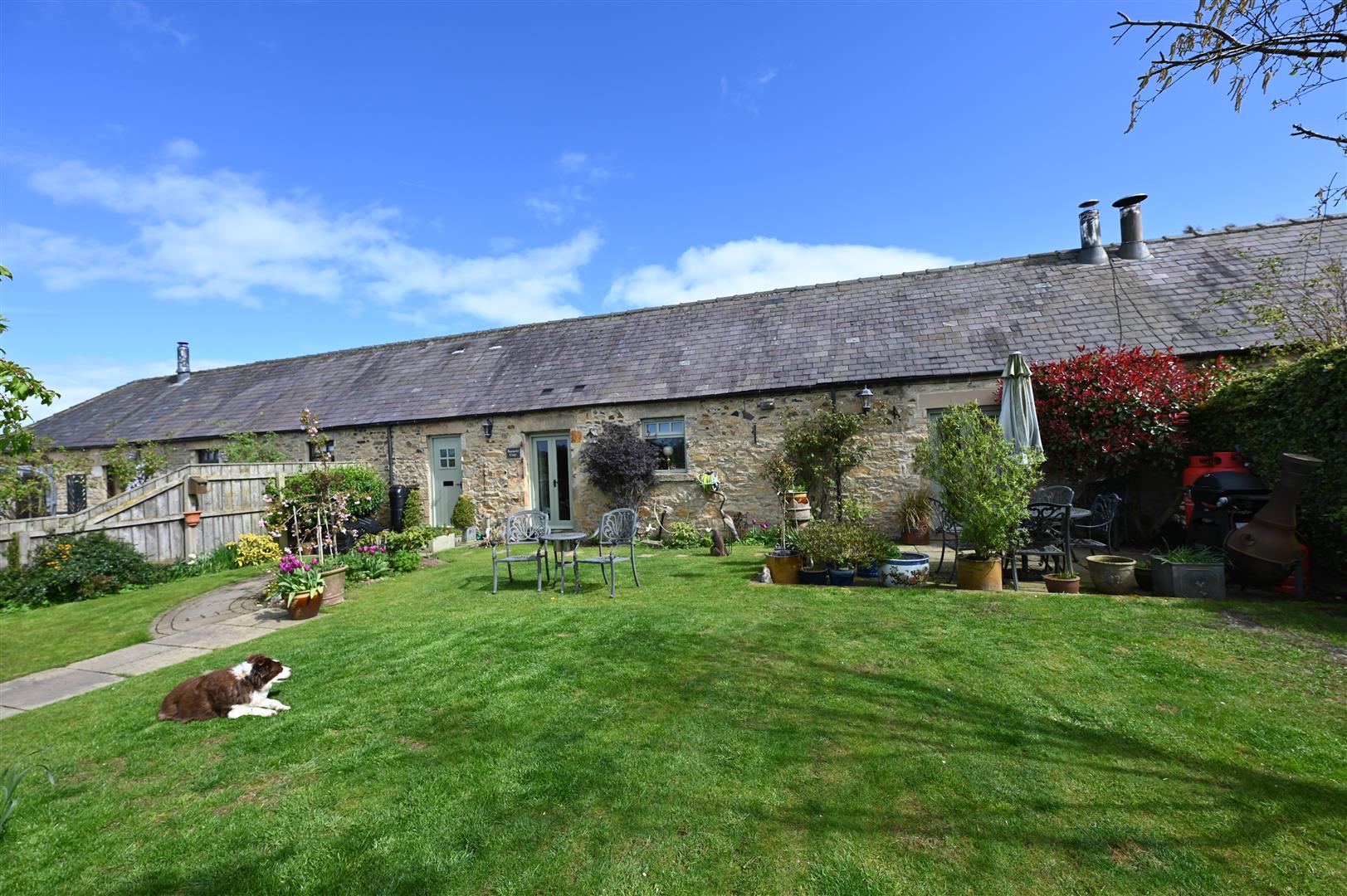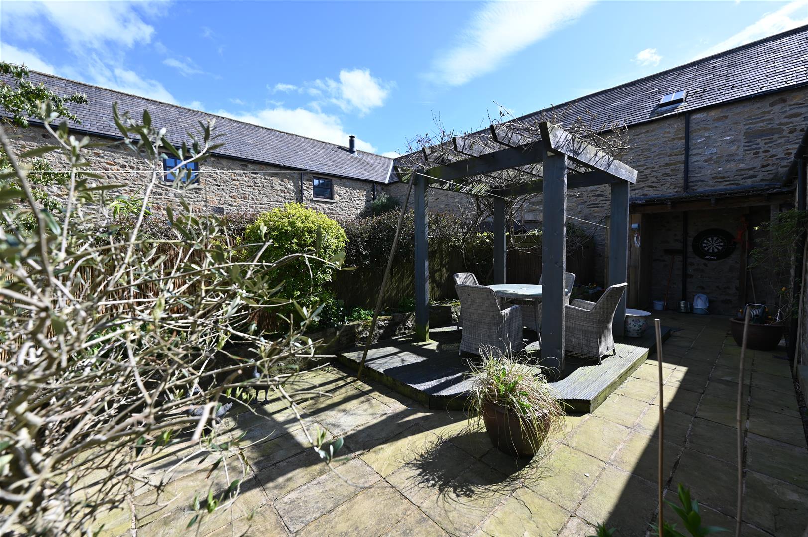 Screened & stone flagged with decked pergola, covered BBQ area, raised stone flower/shrub border, outside light, outside power socket & cold water tap. NB: Barnfield has a right of way for access from the rear.