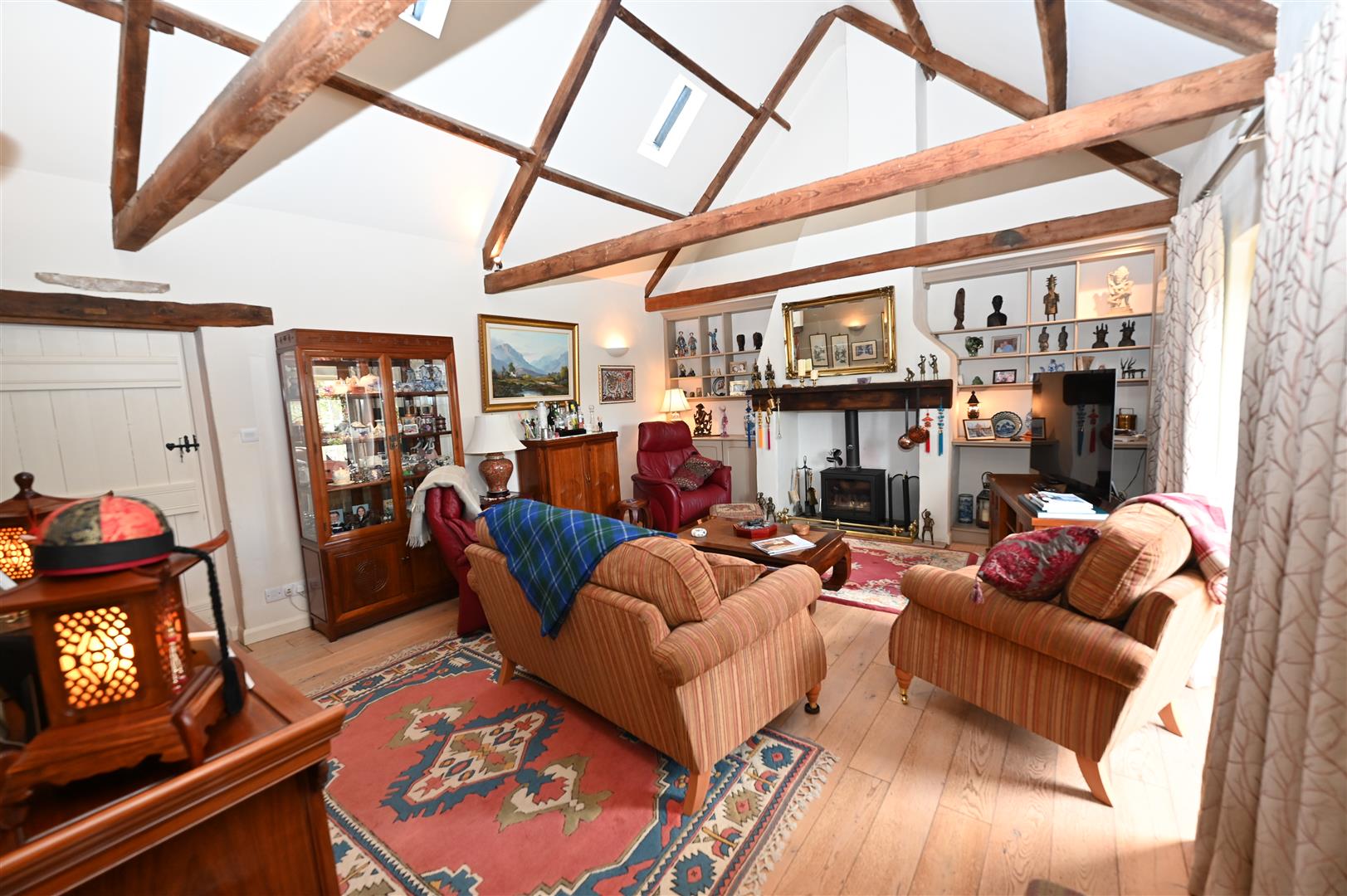 Vaulted truss ceiling, Oak flooring & shelved recess.