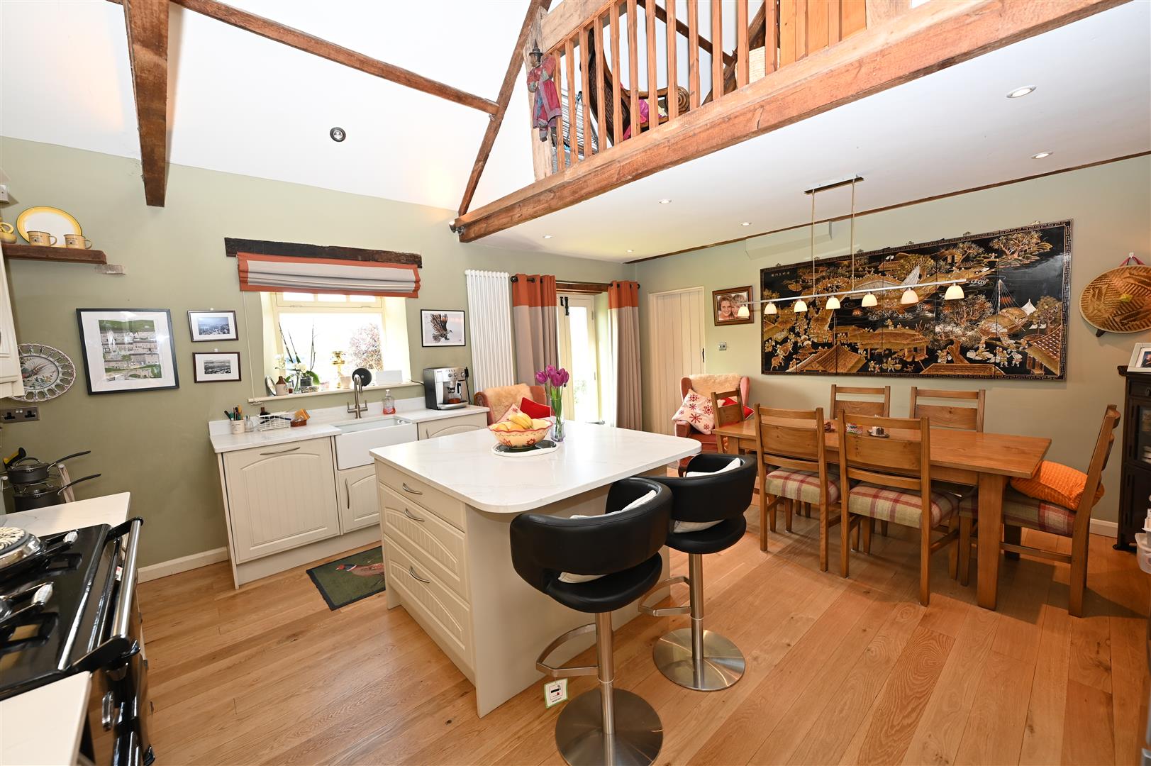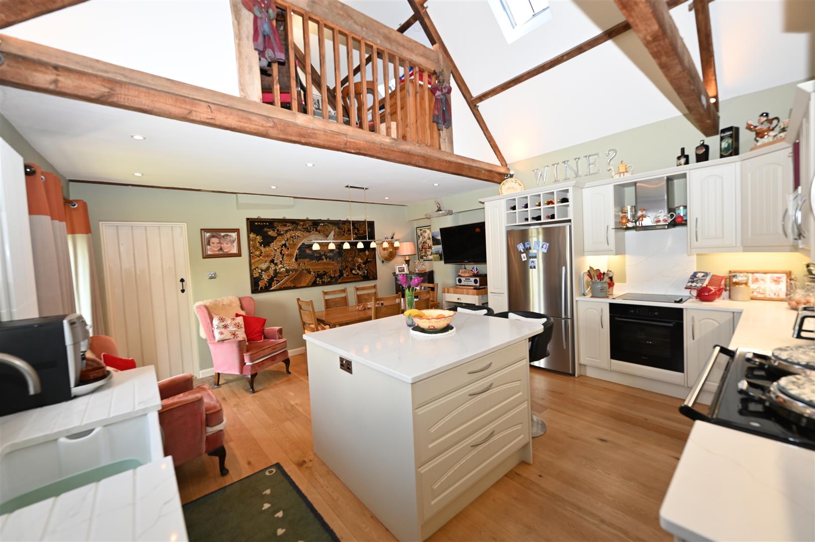 Including built-in storage & coats cupboards, & cupboard with plumbing for washing machine & space for dryer. Oak flooring & staircase to hideaway GALLERIED OFFICE/SNUG (See below).