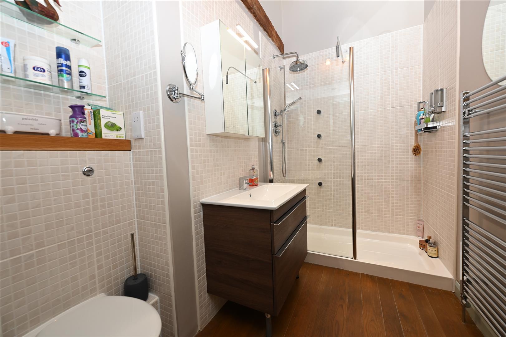 Full-width drench shower, vanity washbasin with drawers & WC. Vaulted truss ceiling with roof light, Oak flooring & towel radiator.