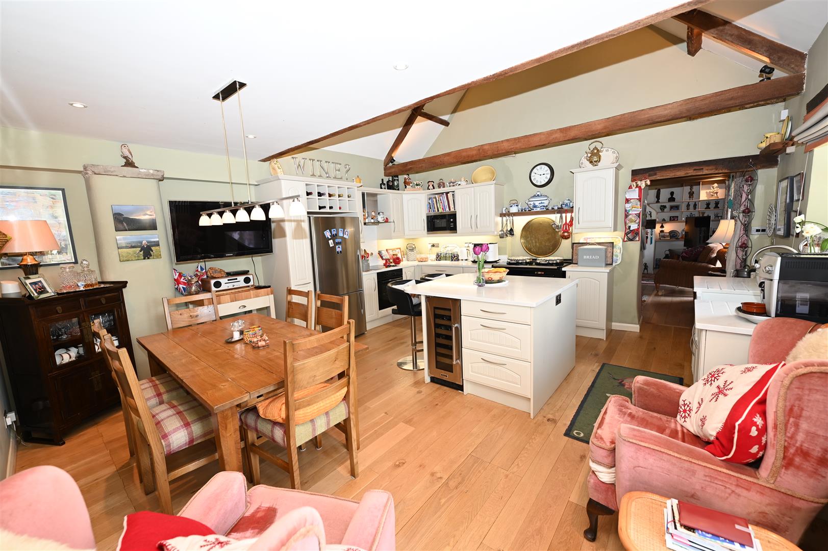 A showstopper with vaulted truss ceilings & fitted with a range of under-lit wall & floor units including pull-out ‘larder’ unit. Onyx worktops, Belfast sink, & breakfast island with integrated wine cooler. Recessed electric Aga, integrated electric oven & ceramic hob with extractor over, integrated microwave & dishwasher. Oak flooring, recessed double glazed window to front, roof light, double doors opening into the garden & doorway to: