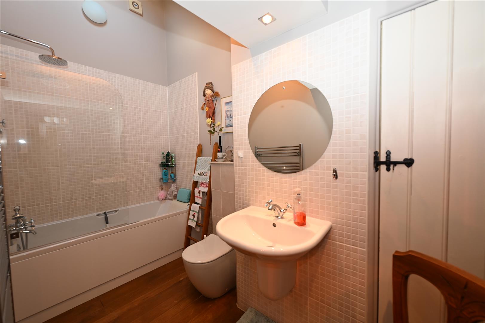 Panelled bath with shower over, ‘floating’ washbasin & inset WC. Built-in cupboard, Oak flooring, roof light & towel radiator.