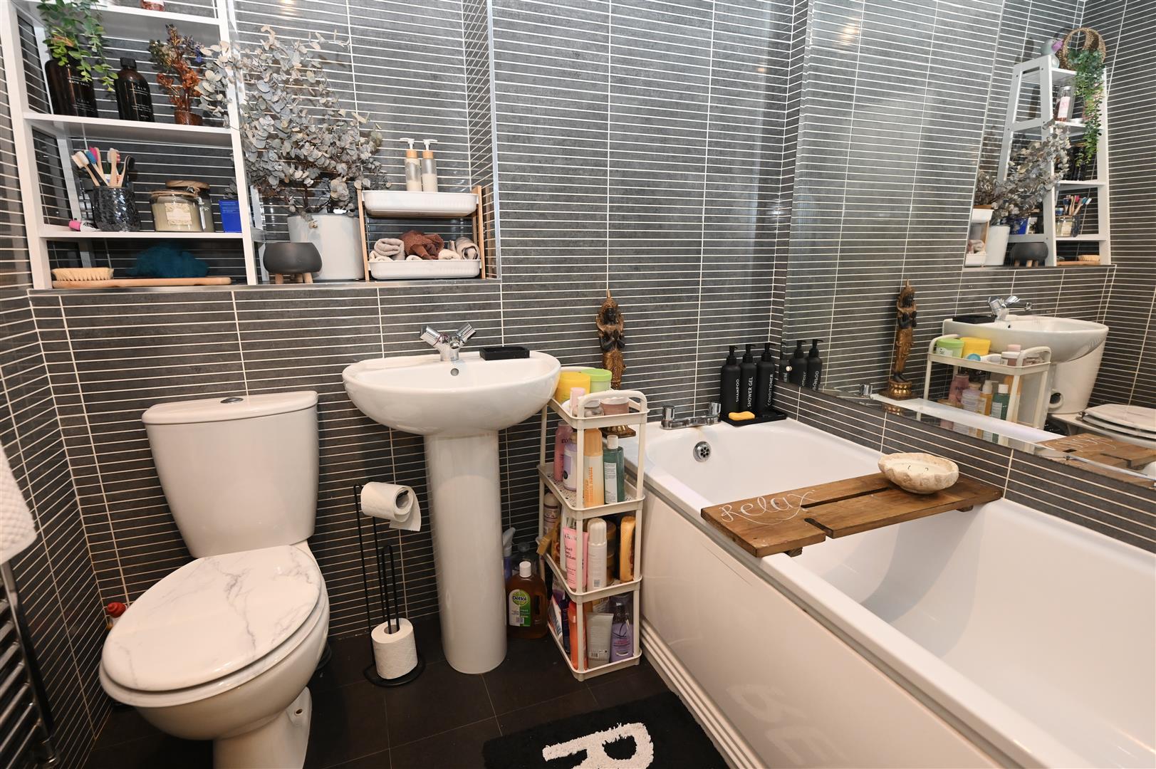 Panelled bath, w.c and a wash hand basin, tiled walls, large bathroom mirror, spot lights and a towel radiator.