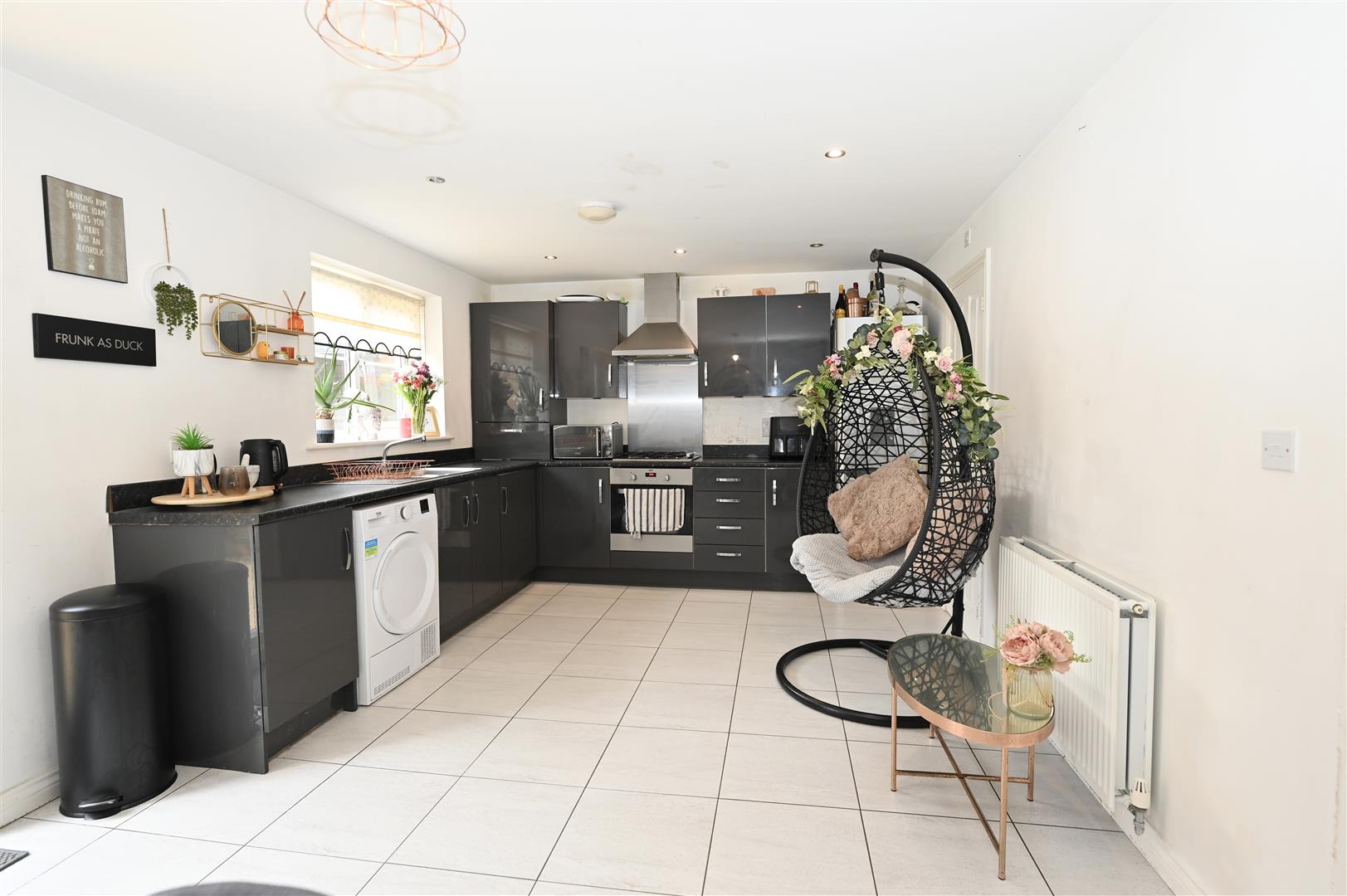 Fitted with a range of wall, base and drawer units with worktops and up stands, electric cooker with a gas hob and a stainless steel extractor hood over,, plumbing for a dishwasher, tiled flooring, central heating radiator, spot lights and French doors leading out to the rear garden and a UPVC double glazed window to the rear. A door leads into the utility room.