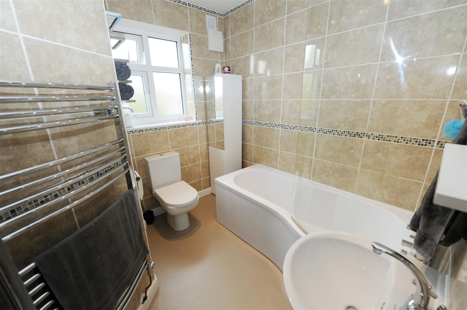 Three piece white suite; low level w.c, shaped panel bath with wall mounted shower mixer and screen, pedestal hand basin with mixer tap, decorative tiling to walls, heated chrome towel rail, extractor fan and UPVC opaque window to rear.