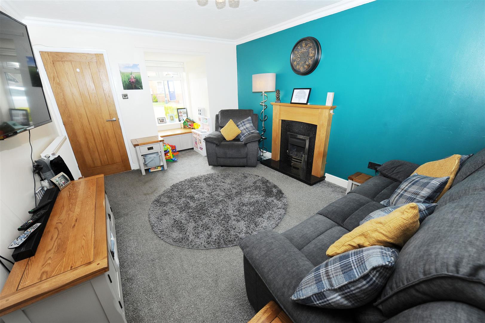 Box window to front, central heating radiator, feature fireplace surround with marble style insert and hearth incorporating a gas fire. Ceiling coving, inner lobby with access to stairs, door to fourth bedroom and door to dining area.
