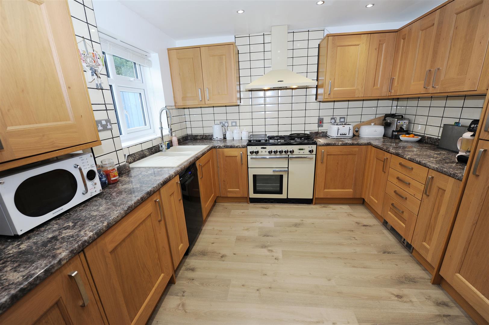 One and half sink unit fed by flexi mixer tap, attractive range of base, drawer and wall units with contrasting work top surfaces. Void for Range Master oven (can be purchased from owner or removed if not required), integrated washing machine, fridge, freezer and plumbing for dishwasher. Range Master extractor hood and cream tiling to splash areas. Wall mounted Baxi boiler, kick floor heater, laminated floor, down lighting and UPVC window to rear.