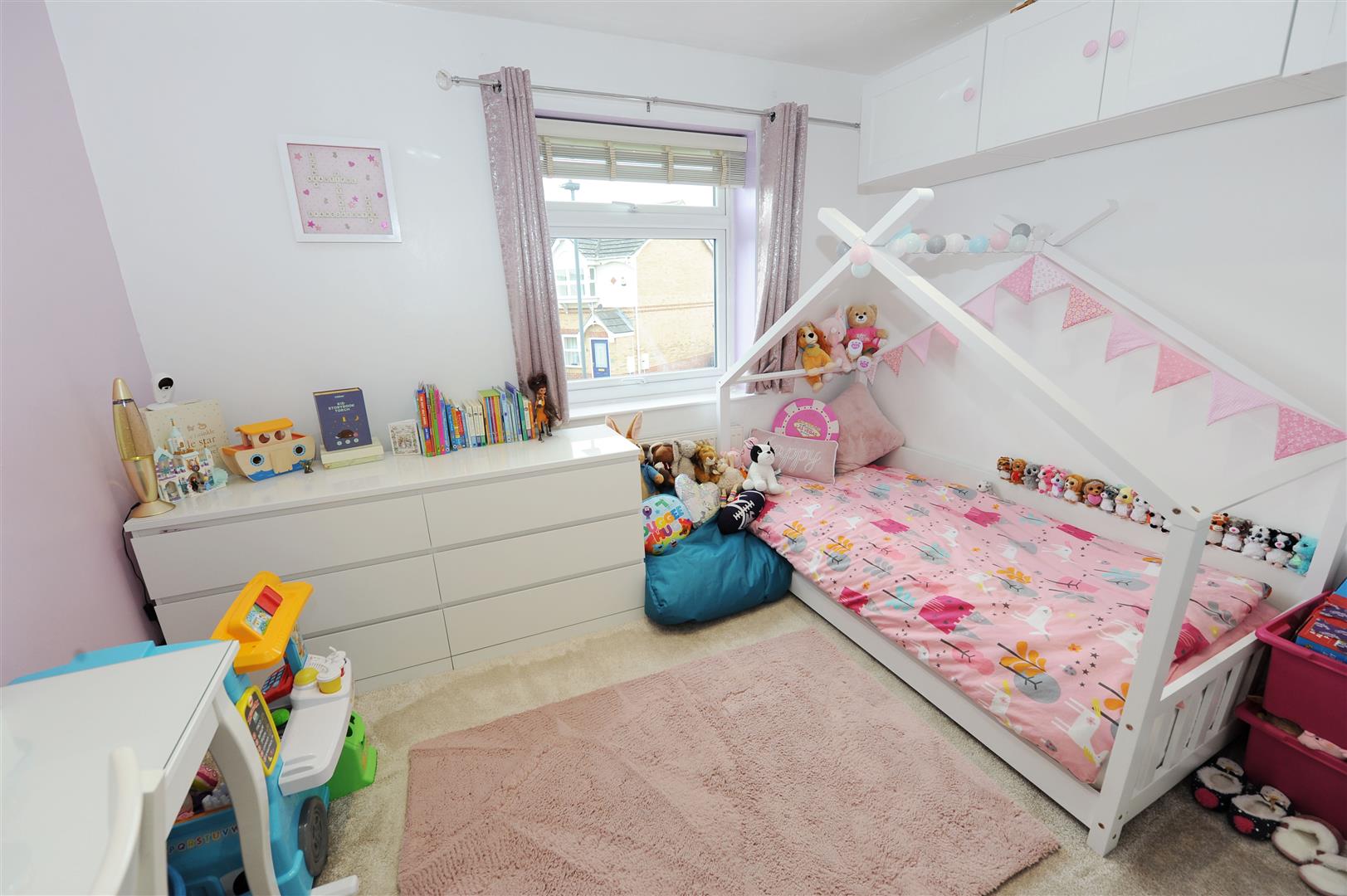 Driveway for parking of 2 cars, the former garage has been converted into the 4th bedroom however there is some storage to the front with up and over door.