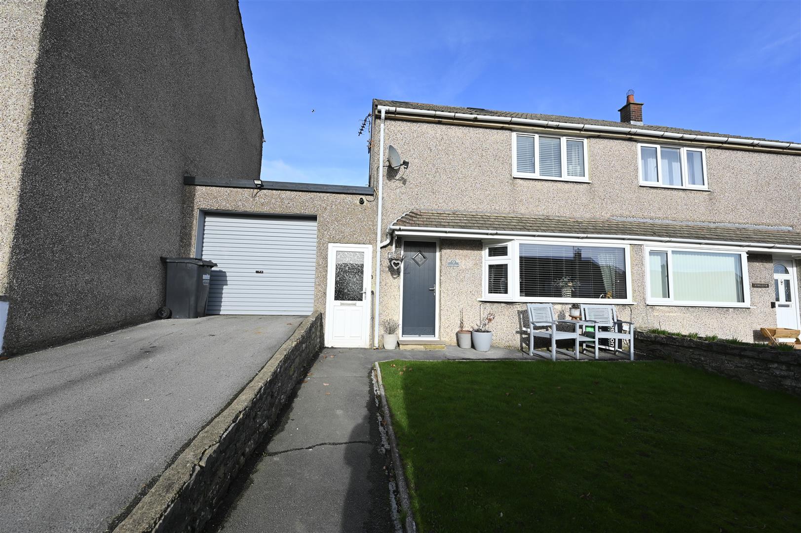 Comprising of hard standing flagged area enjoying distant countryside views and a lawned area.
