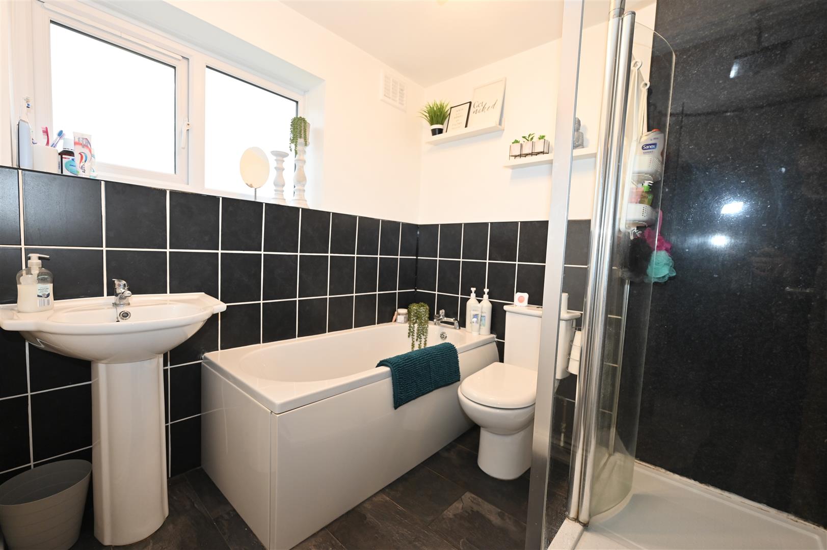 Four piece contemporary suite comprising of pedestal wash hand basin with mixer taps, panelled bath with mixer taps. Low level WC. Contemporary glass shower cubicle. Tiling to splash areas. towel rail and UPVC double glazed window to side.