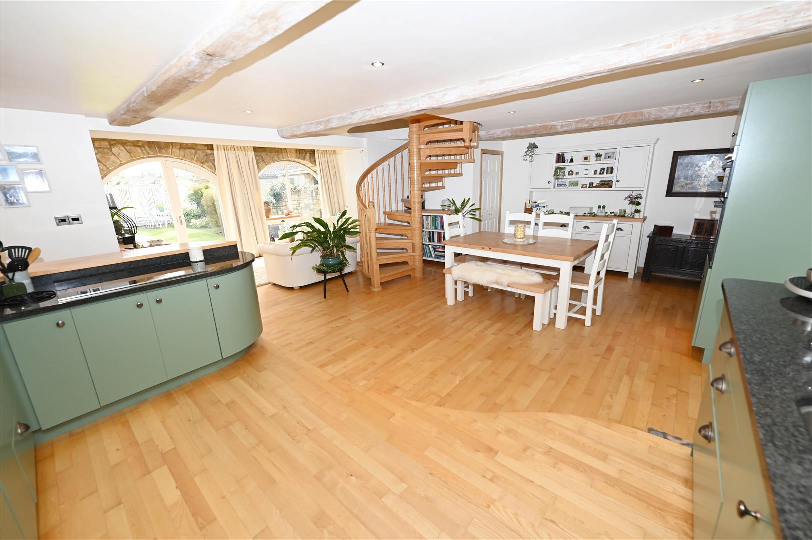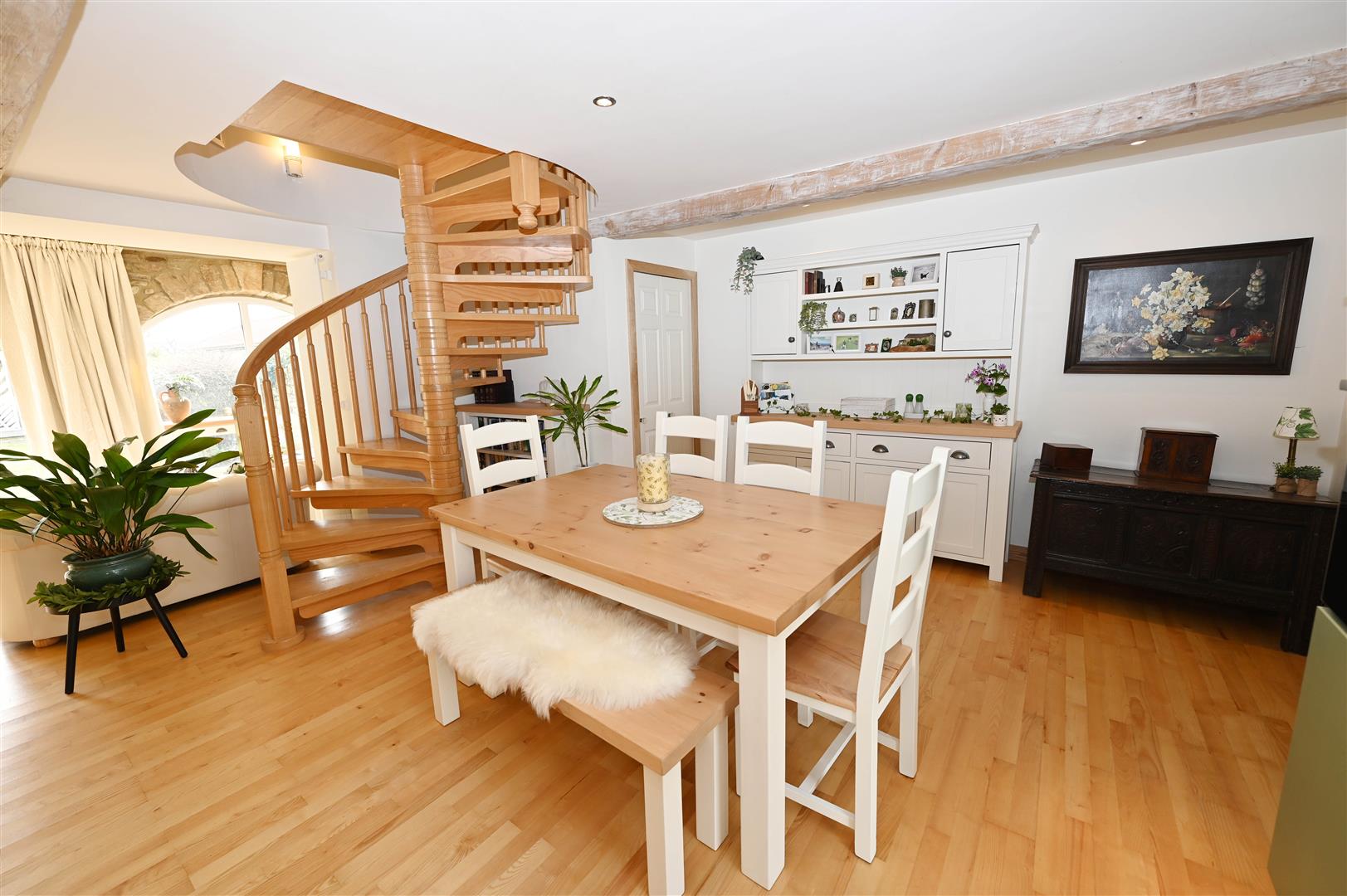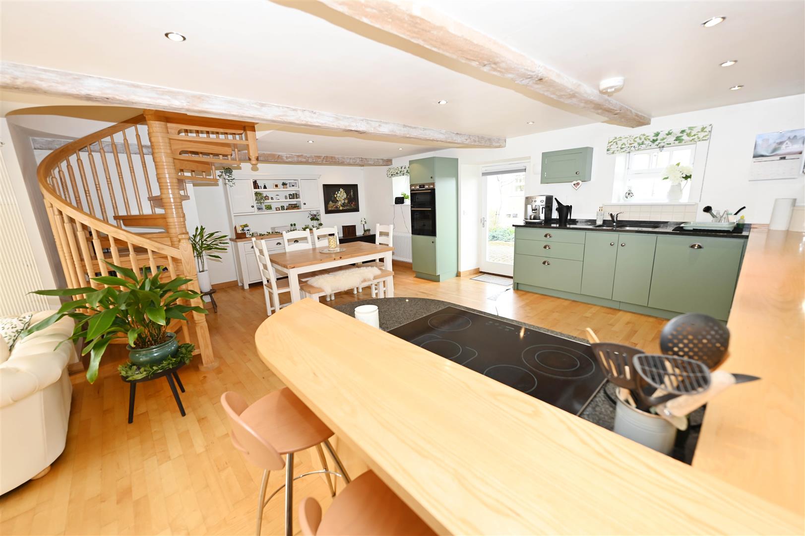 A great space with Oak flooring & a ‘contour-raised’ KITCHEN AREA fitted wall & floor units, Beech & Granite worktops, breakfast bar, integrated ceramic hob, eye-level oven, fridge, freezer & dishwasher. Large DINING AREA. Beamed ceiling with down-lighting. 2 double-glazed windows & door to rear. Store (1.32m x 1.00m/4'3" x 3'3") & American Ash spiral staircase to: