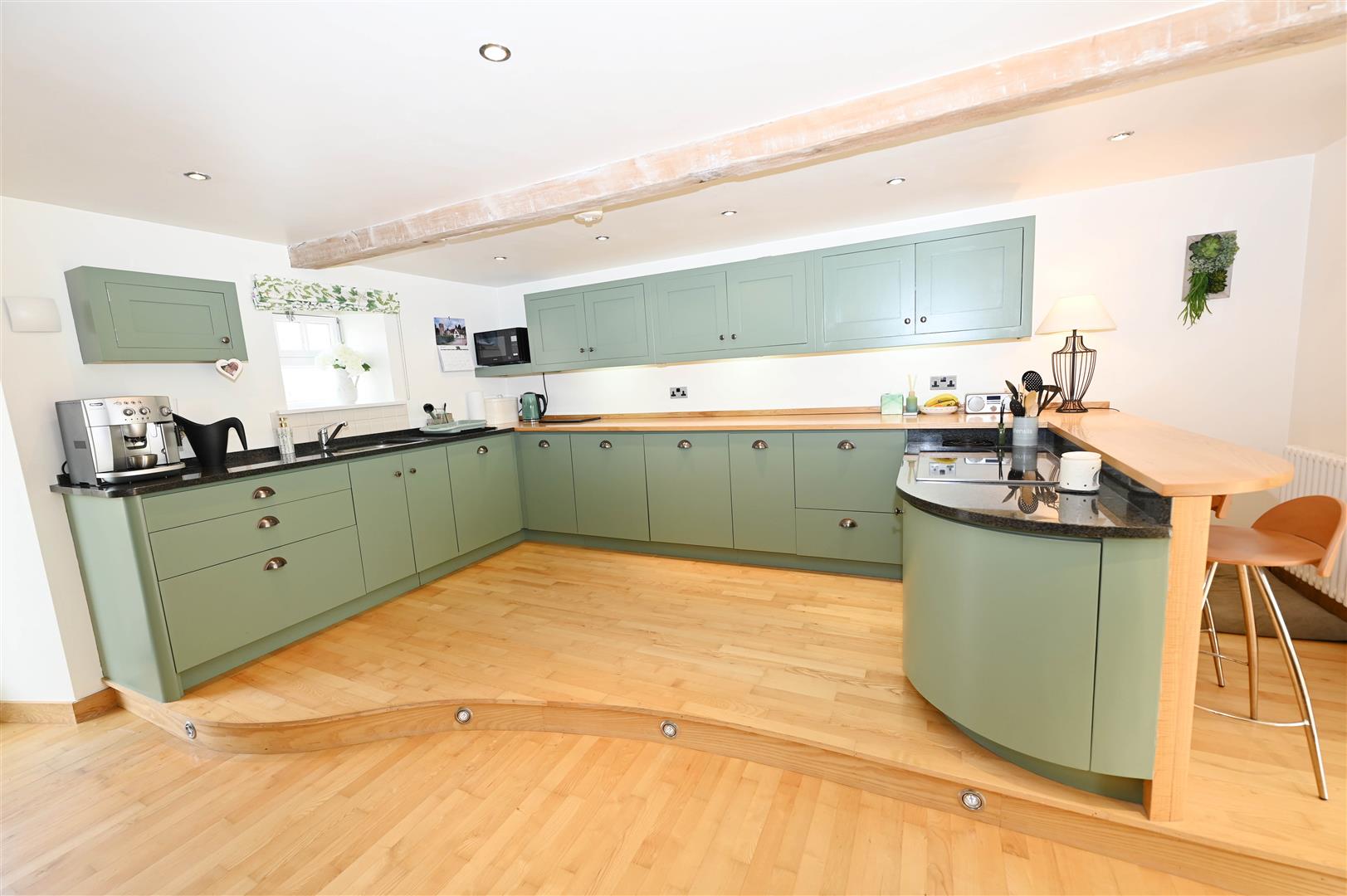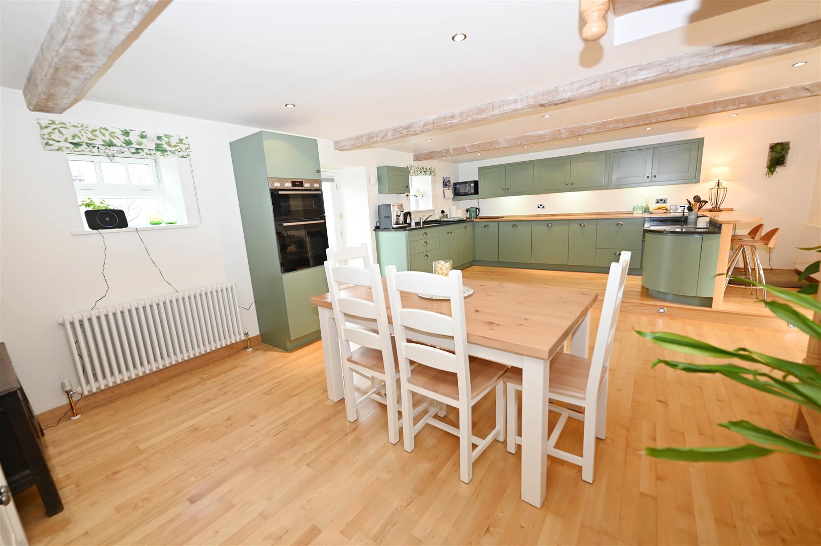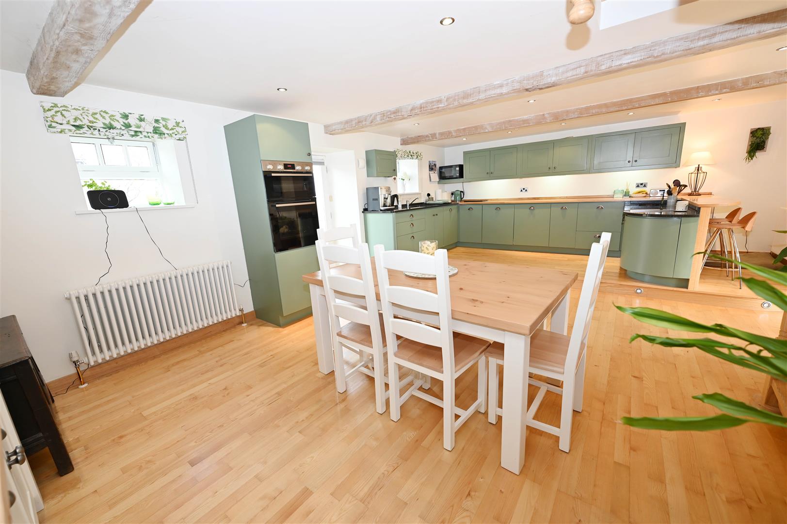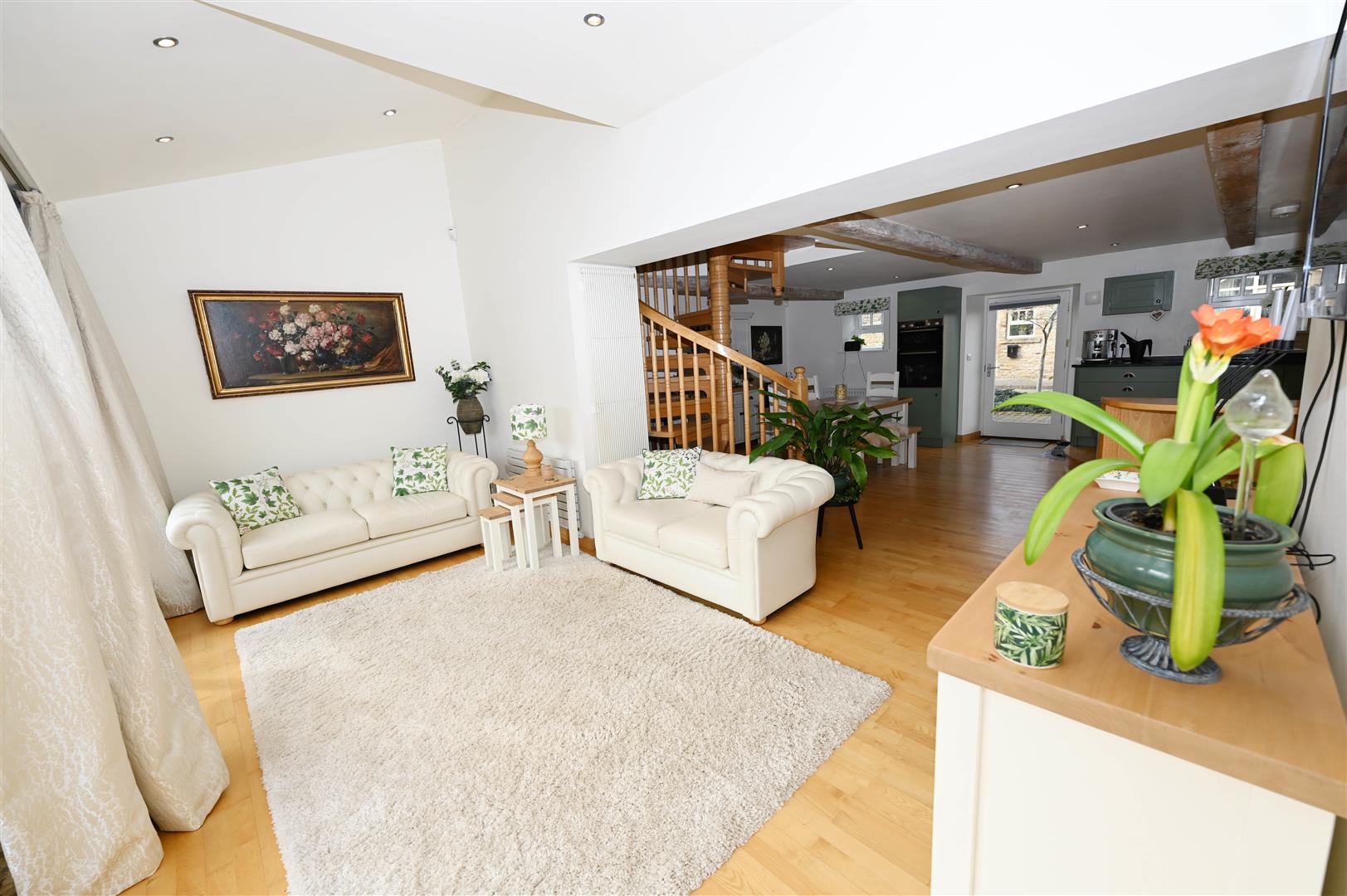 A great space with Oak flooring & a ‘contour-raised’ KITCHEN AREA fitted wall & floor units, Beech & Granite worktops, breakfast bar, integrated ceramic hob, eye-level oven, fridge, freezer & dishwasher. Large DINING AREA. Beamed ceiling with down-lighting. 2 double-glazed windows & door to rear. Store (1.32m x 1.00m/4'3" x 3'3") & American Ash spiral staircase to: