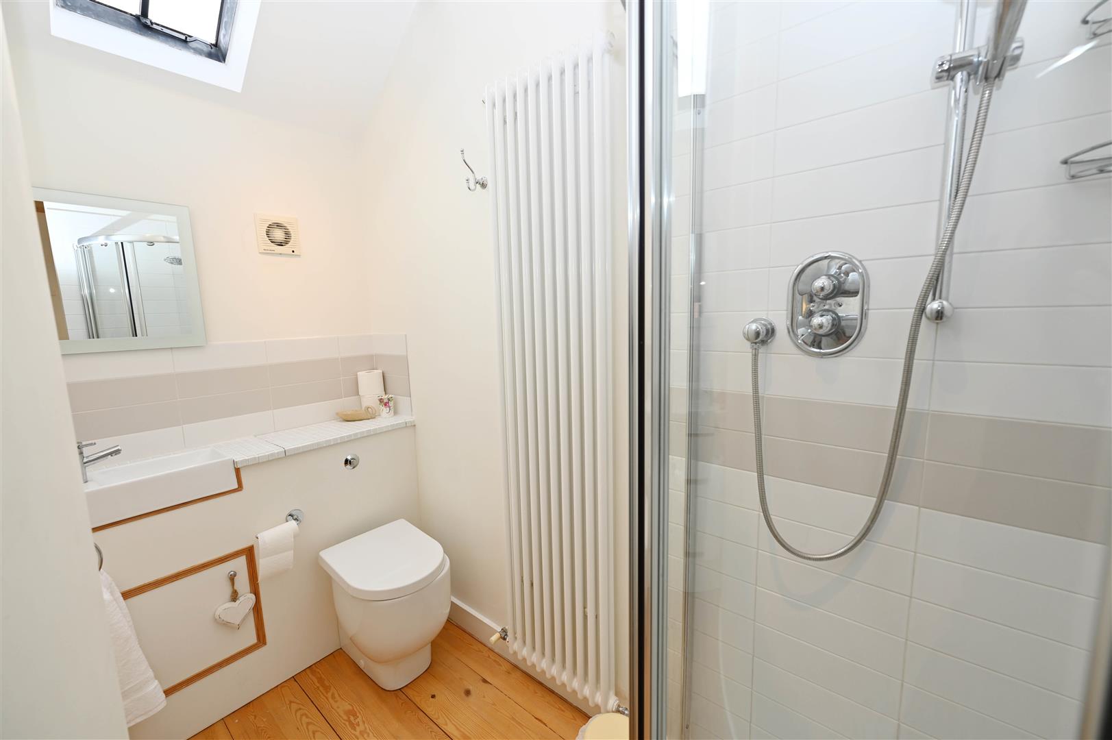 Shower cubicle, inset washbasin & WC with cupboards. Double-glazed Velux window.