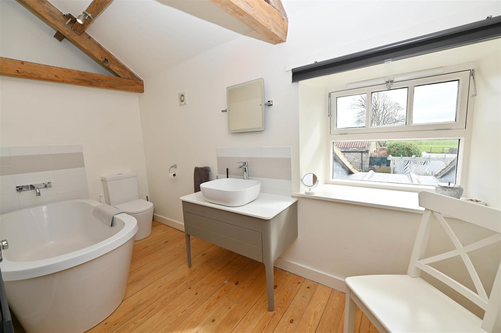 Free-standing bath, washbasin with drawers under & WC. Double-glazed window to front with countryside views.