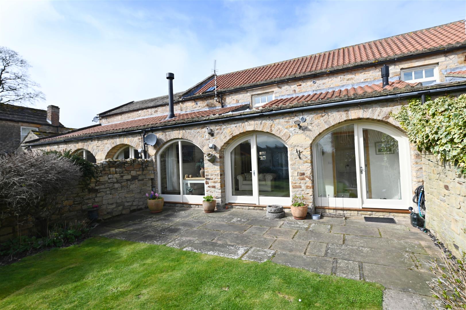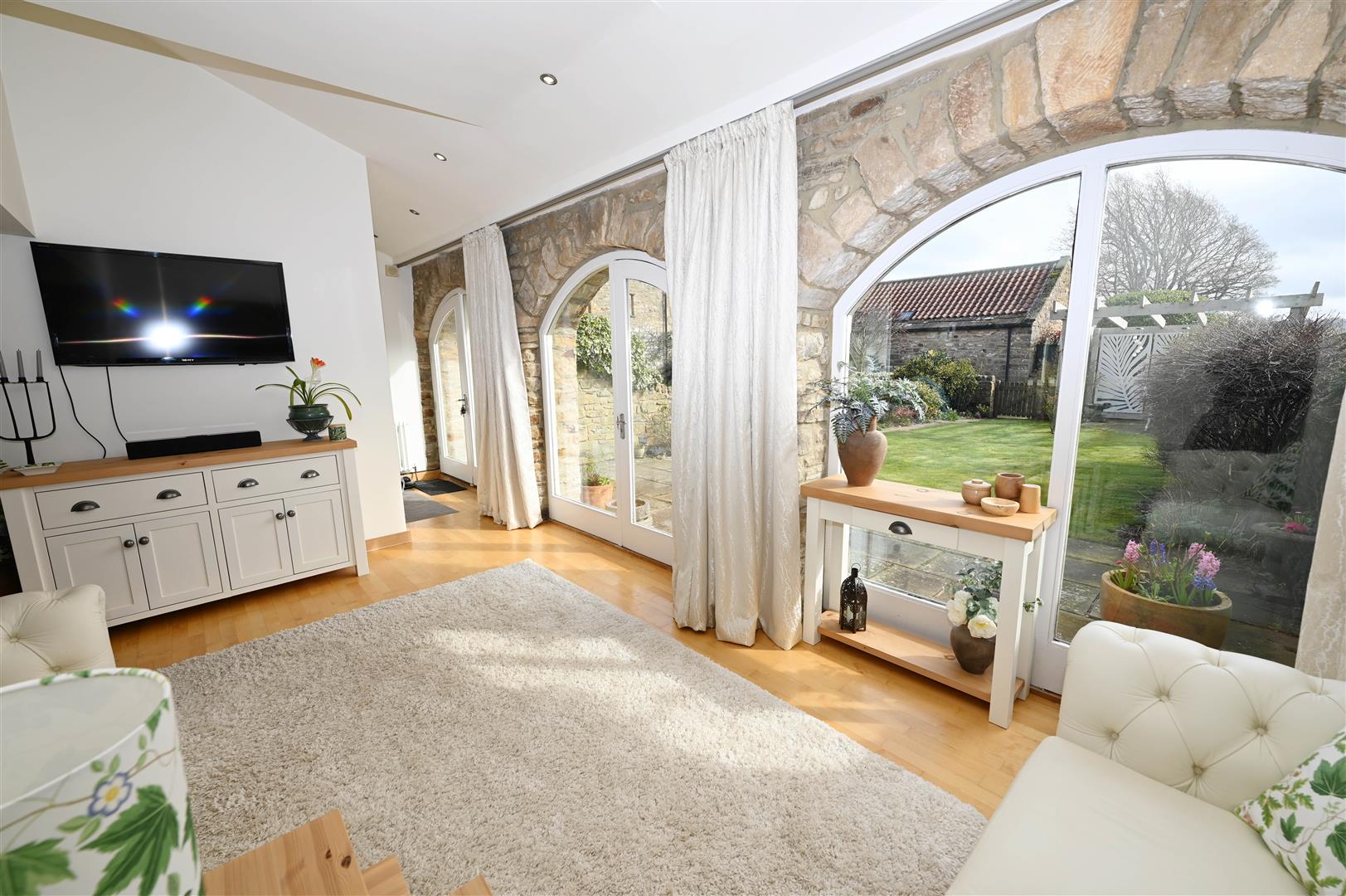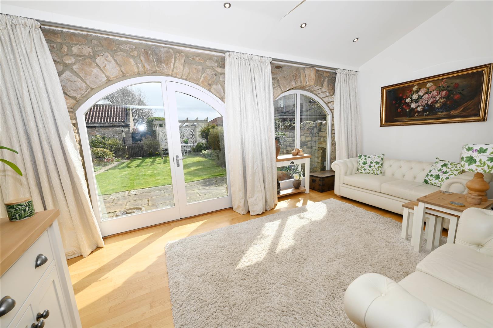 Exposed stonework with cartway arch windows overlooking the South-East facing gardens. Down-lighting & open to: