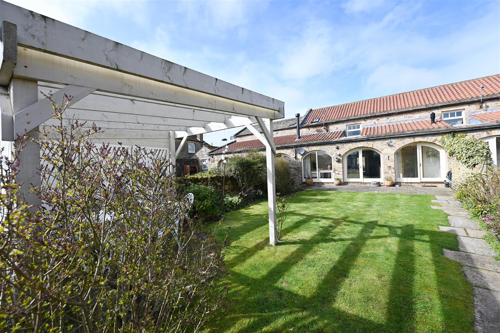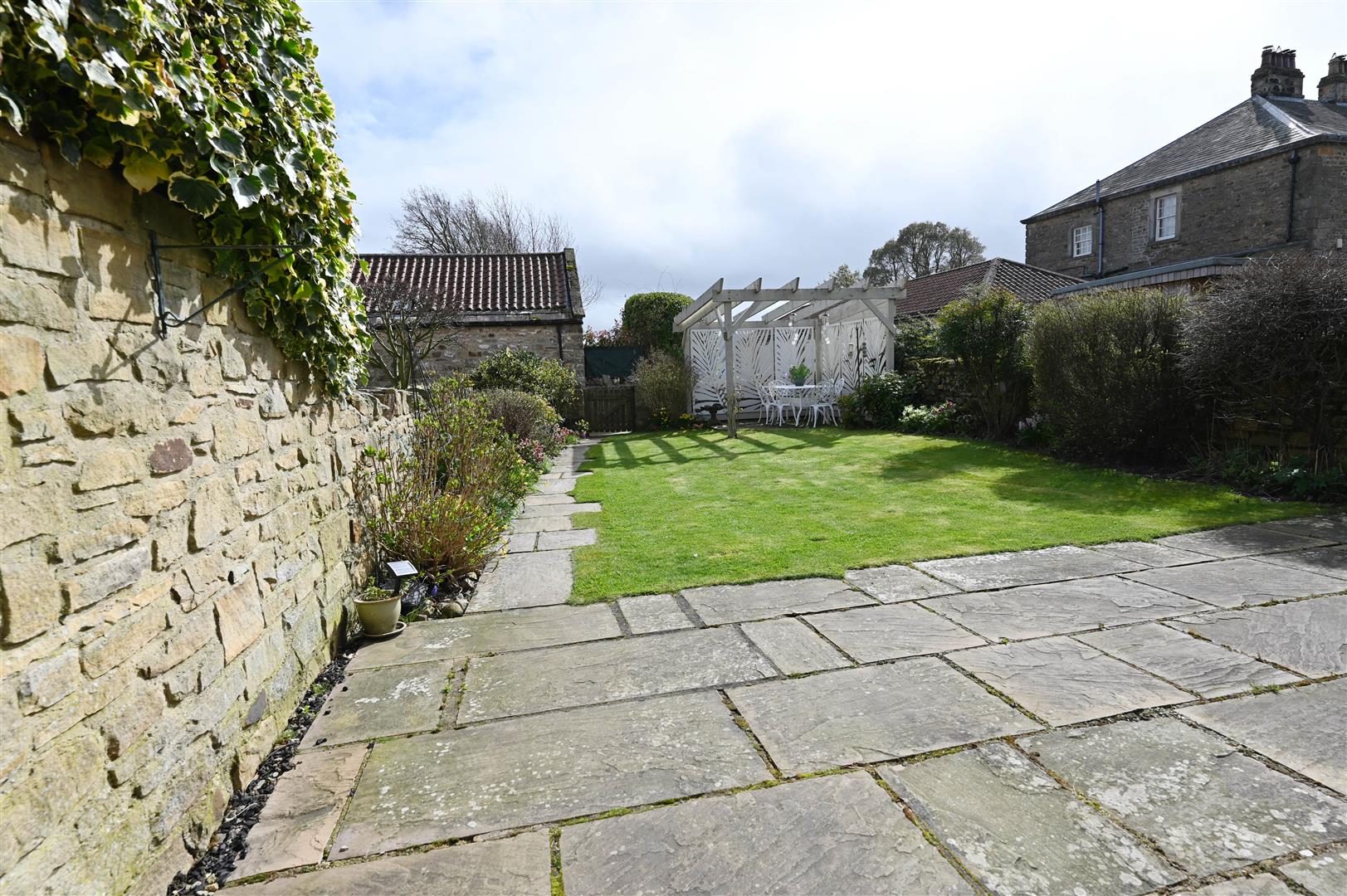 Stone boundary walls, full-width flagged patio, lawn with flower/shrub borders, pergola, light, power & cold-water tap