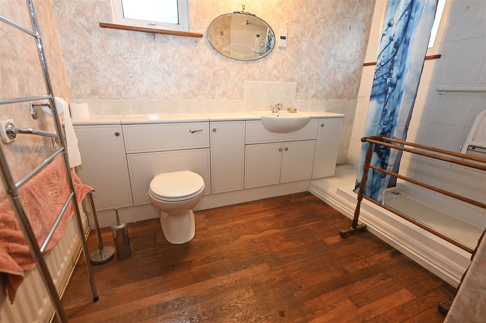 Walk in shower with a Mira electric shower, wash hand basin with fitted storage cupboards beneath, w.c, central heating radiator, wooden flooring, extractor fan, under stairs store cupboard and two double glazed windows.