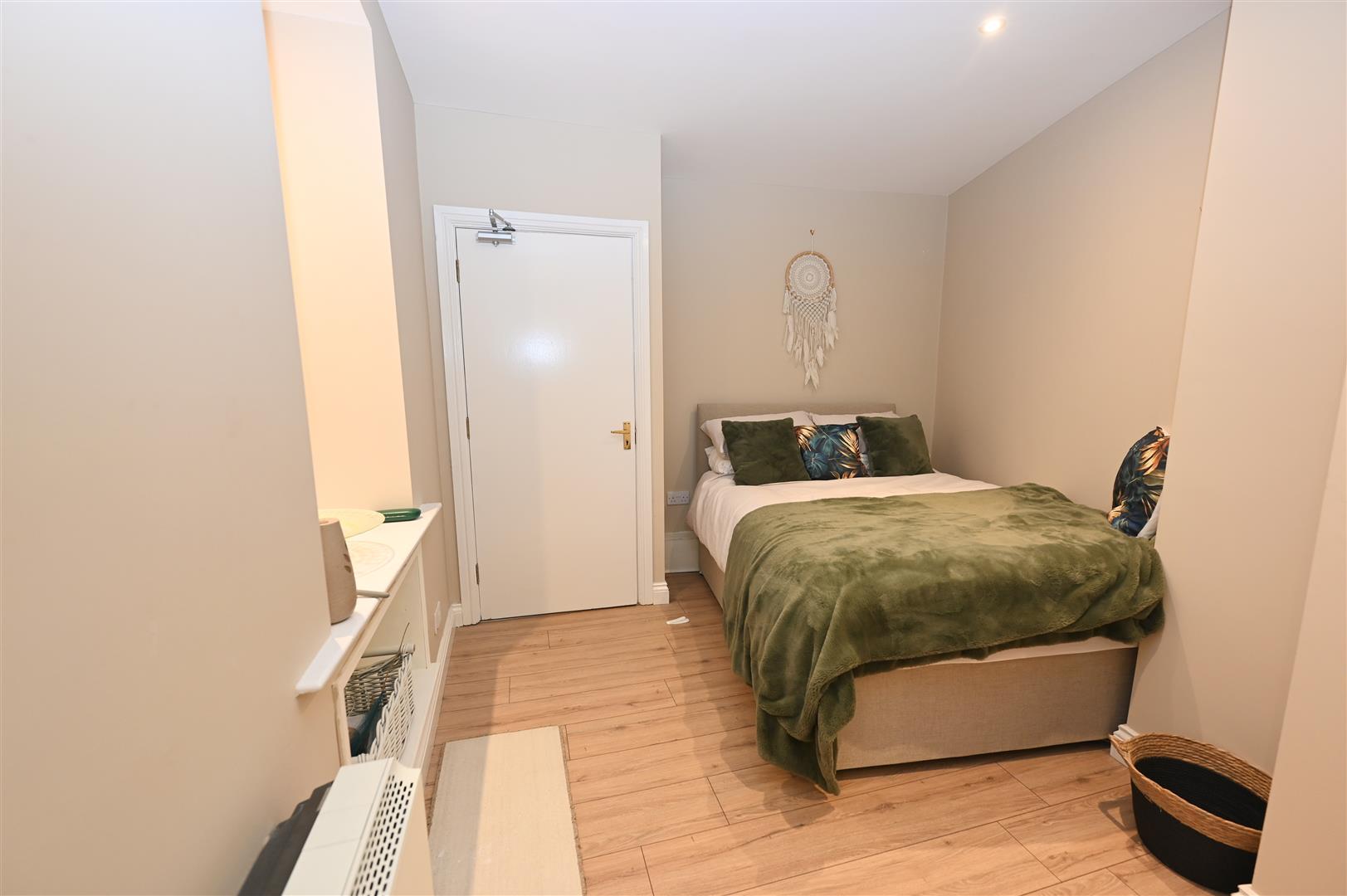 A 'narrowing room' with fitted wardrobes and fitted shelving unit. Sliding sash window to the front, electric radiator and spot lights.