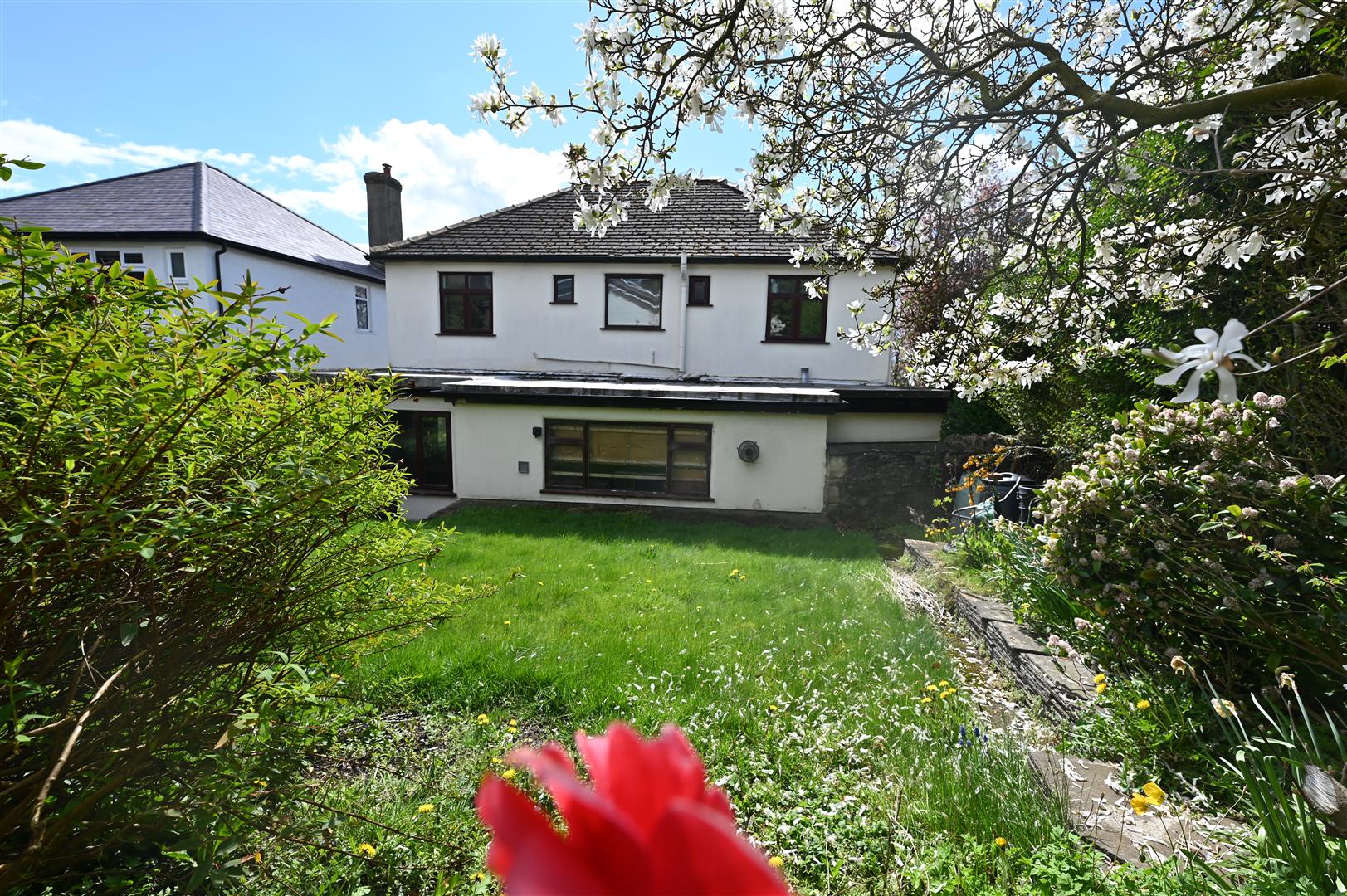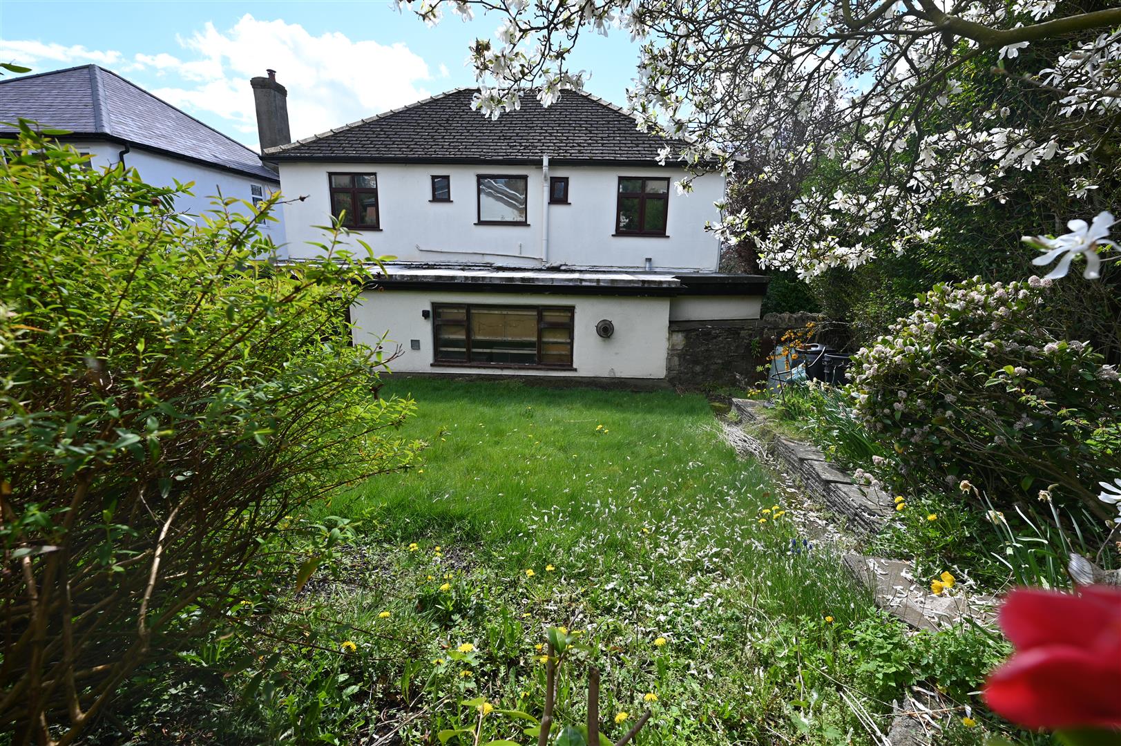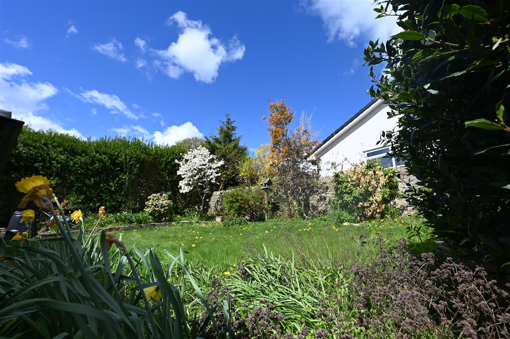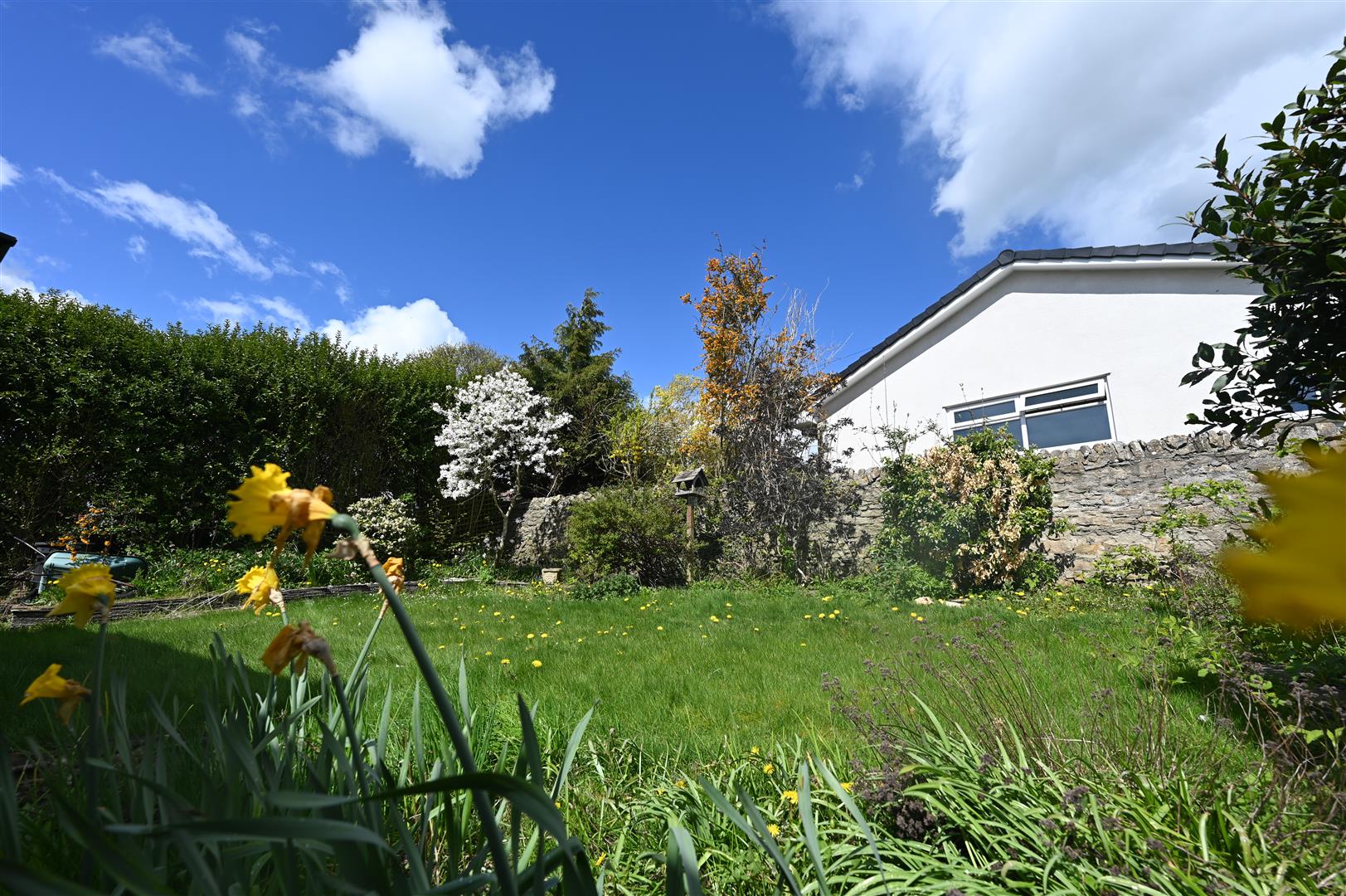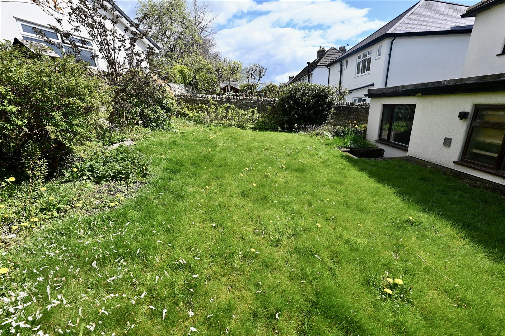 The rear garden is enclosed with a stone wall and has a lawned area surrounded by mature trees and shrubs.