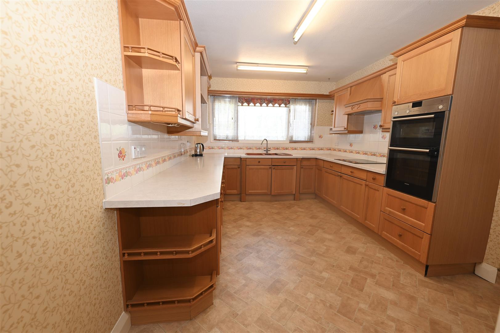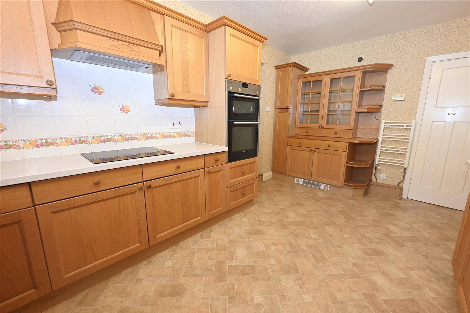 With a range of wooden wall, base and drawer units with worktops, one and a half bowl sink unit with mixer tap over, glass display units, corner display units, Siemens tower oven, Bosch electric hob, extractor hood, integrated fridge, tiled splashback, UPVC double glazed window to the front and an integral door leading into the garage.