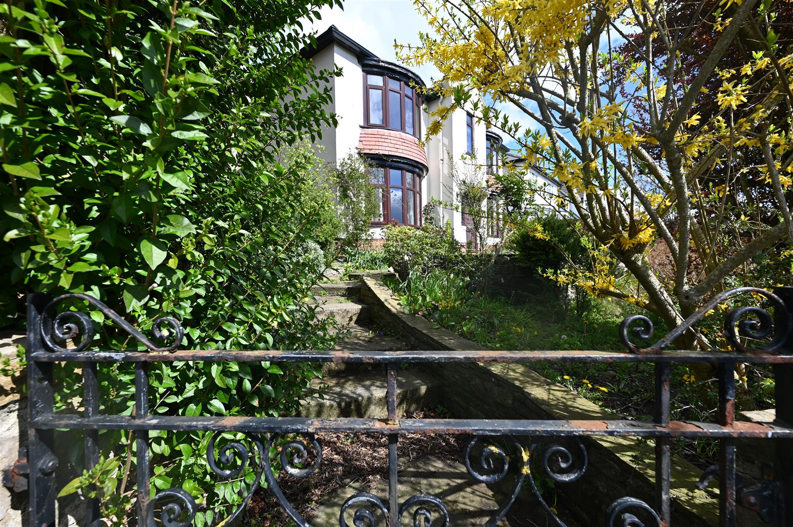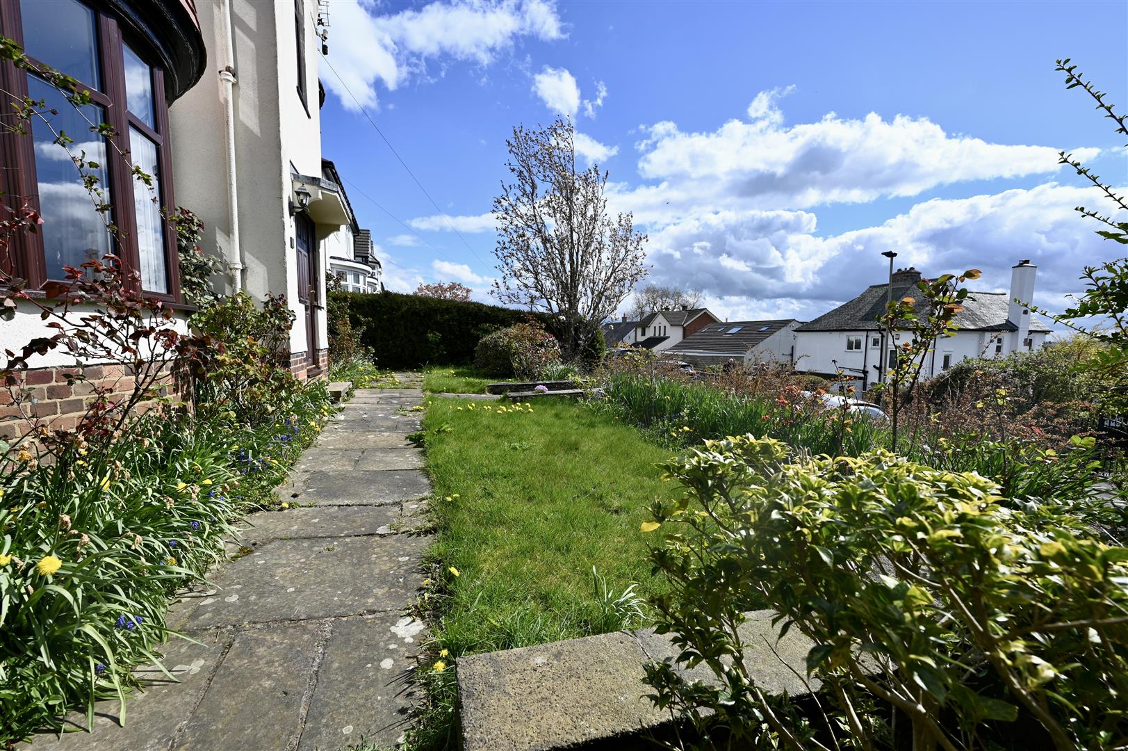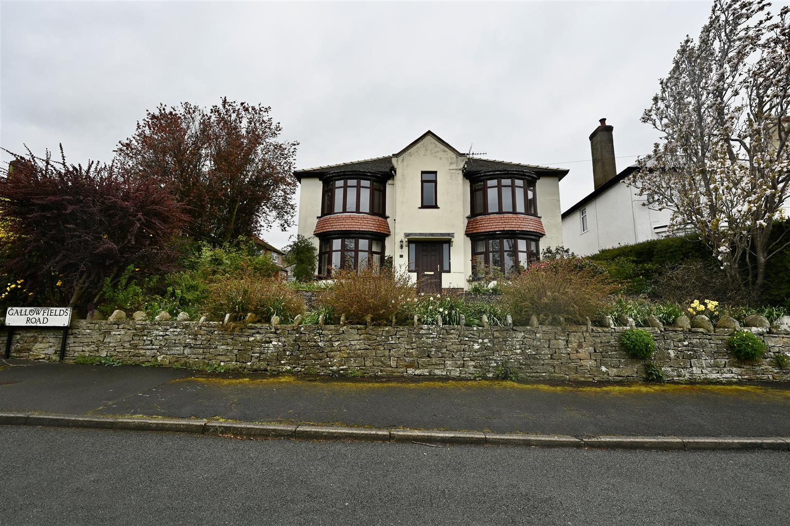 The property is elevated with lovely views to the front. An iron gate and flagged steps lead to the front of the property which has a lawned area , flagged patio area and mature trees and shrubs. A walkway to the side of the property leads to the rear garden.