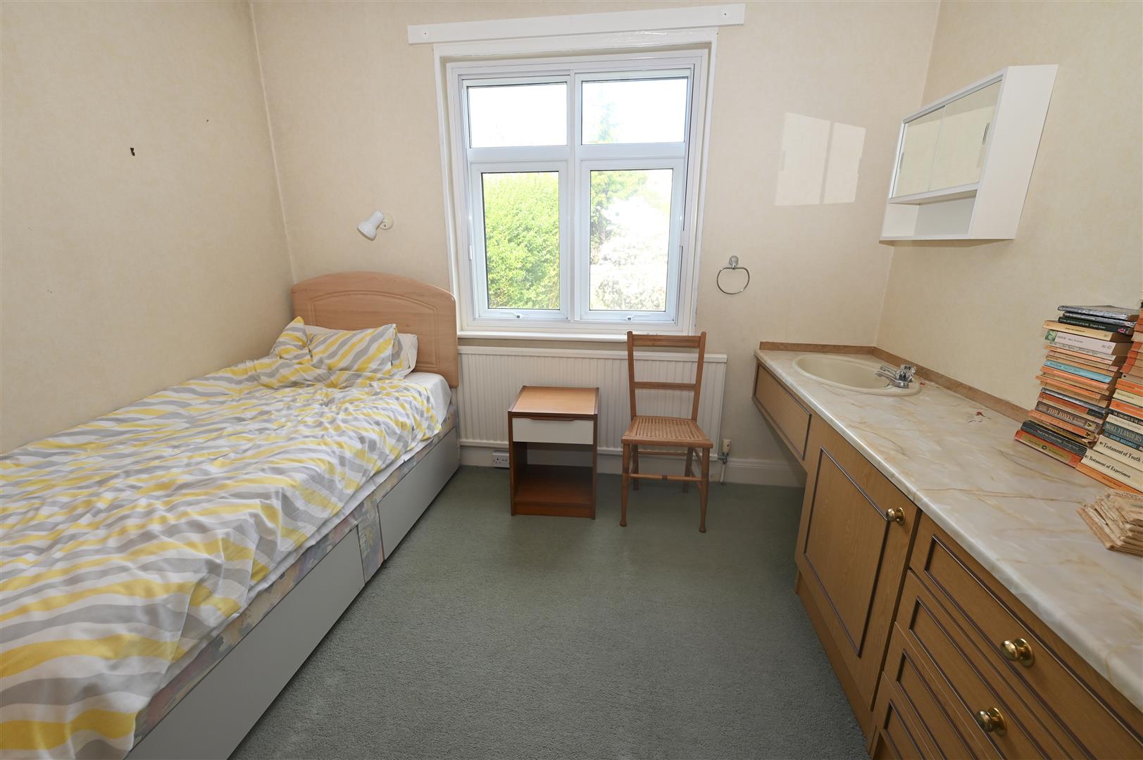 A double bedroom with a UPVC double glazed window to the rear with secondary glazing, central heating radiator, wall light and fitted base and drawer unit with a worktop and inset sink.