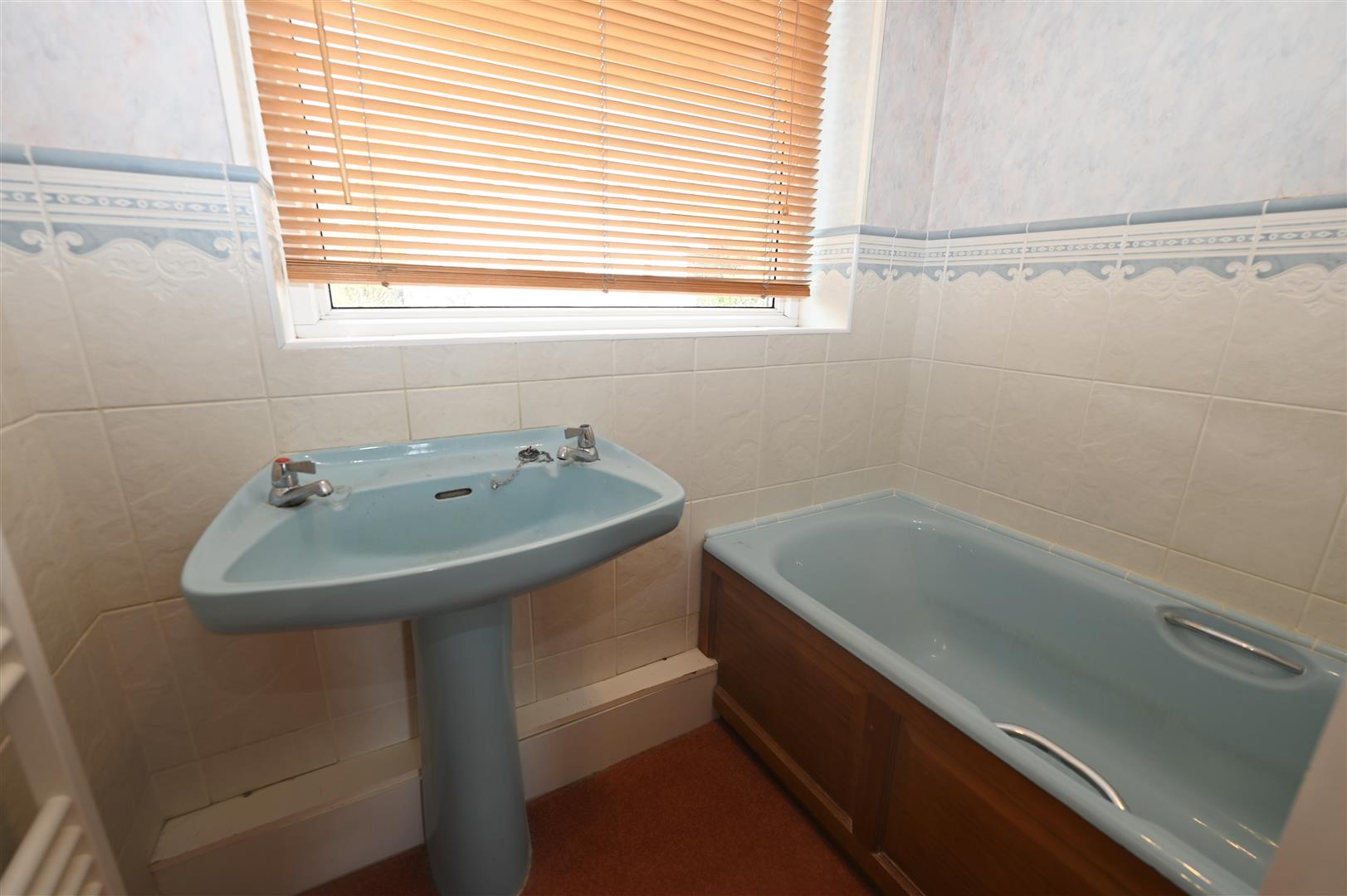 With a panelled bath, wash hand basin, towel radiator, part tiled walls and a UPVC double glazed window to the rear.
