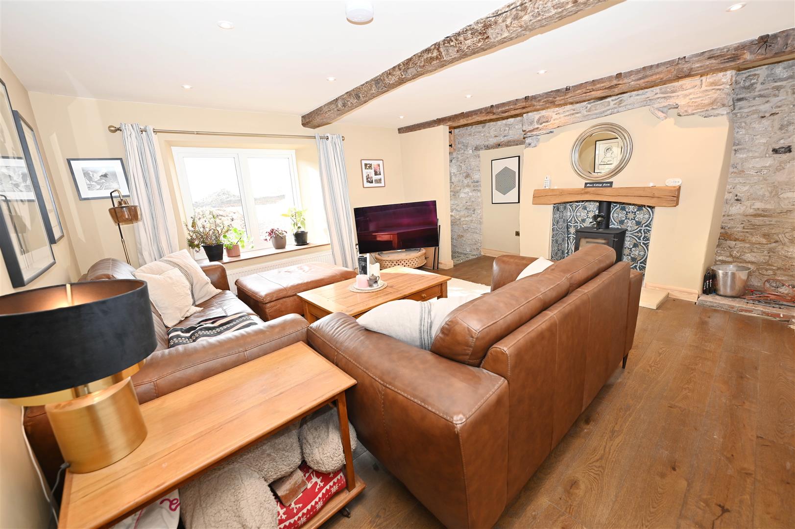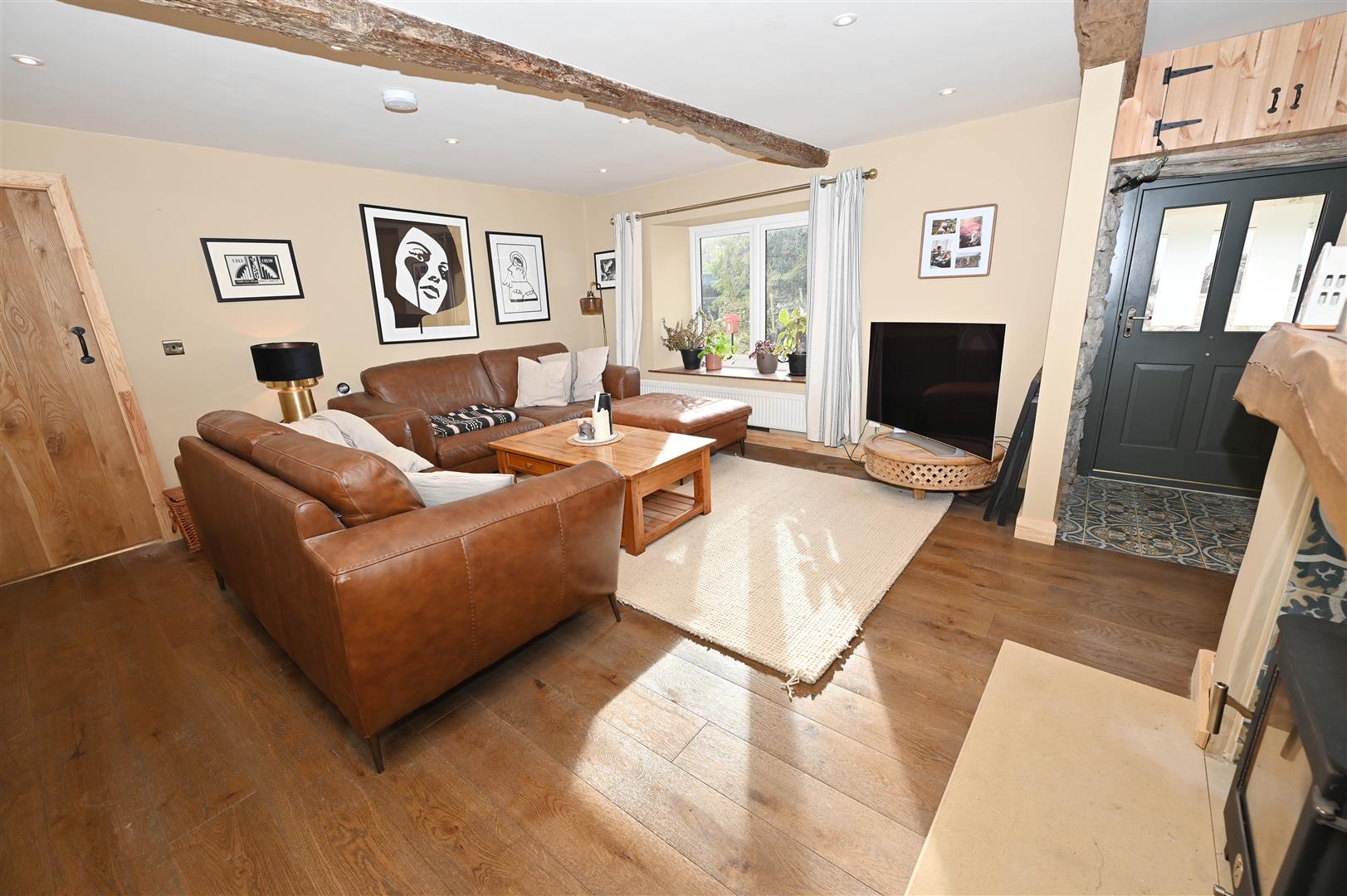 A lovely cosy room with feature fireplace & woodstove, exposed stonework, ceiling beams & Oak flooring. Down-lighting ,recessed double-glazed window & door to front, & door to: