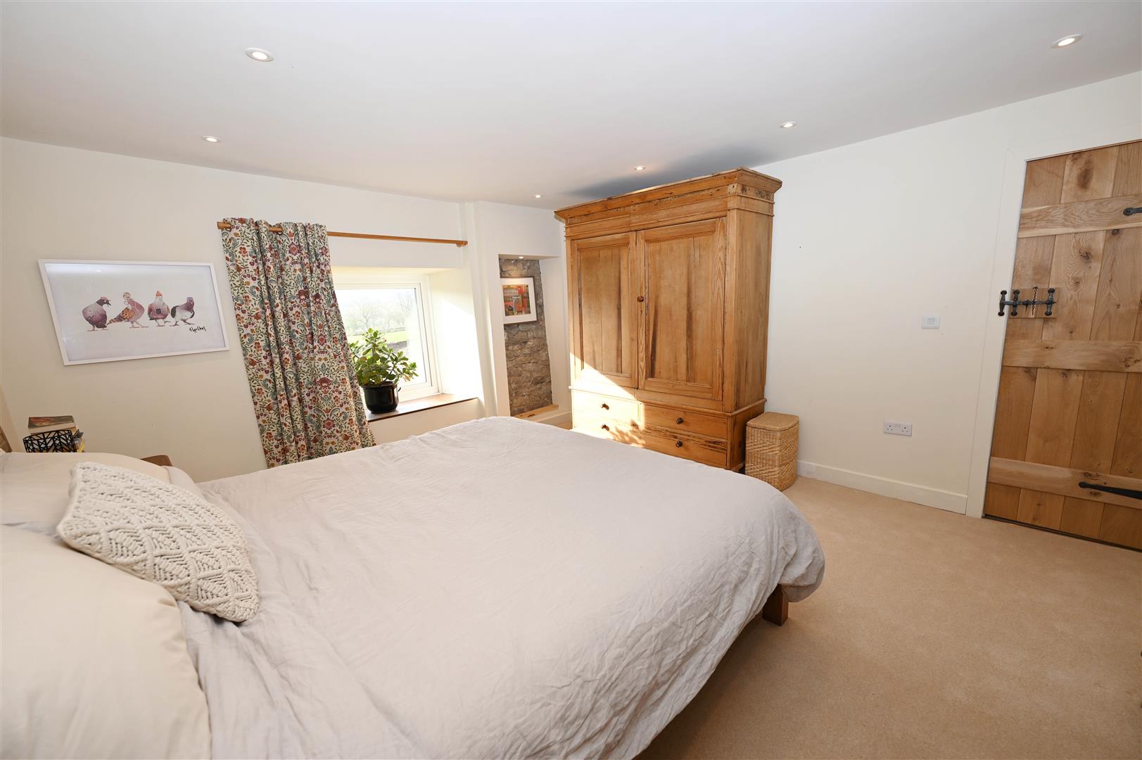 Exposed stonework, built-in cupboard & shelved nook. Down-lighting.