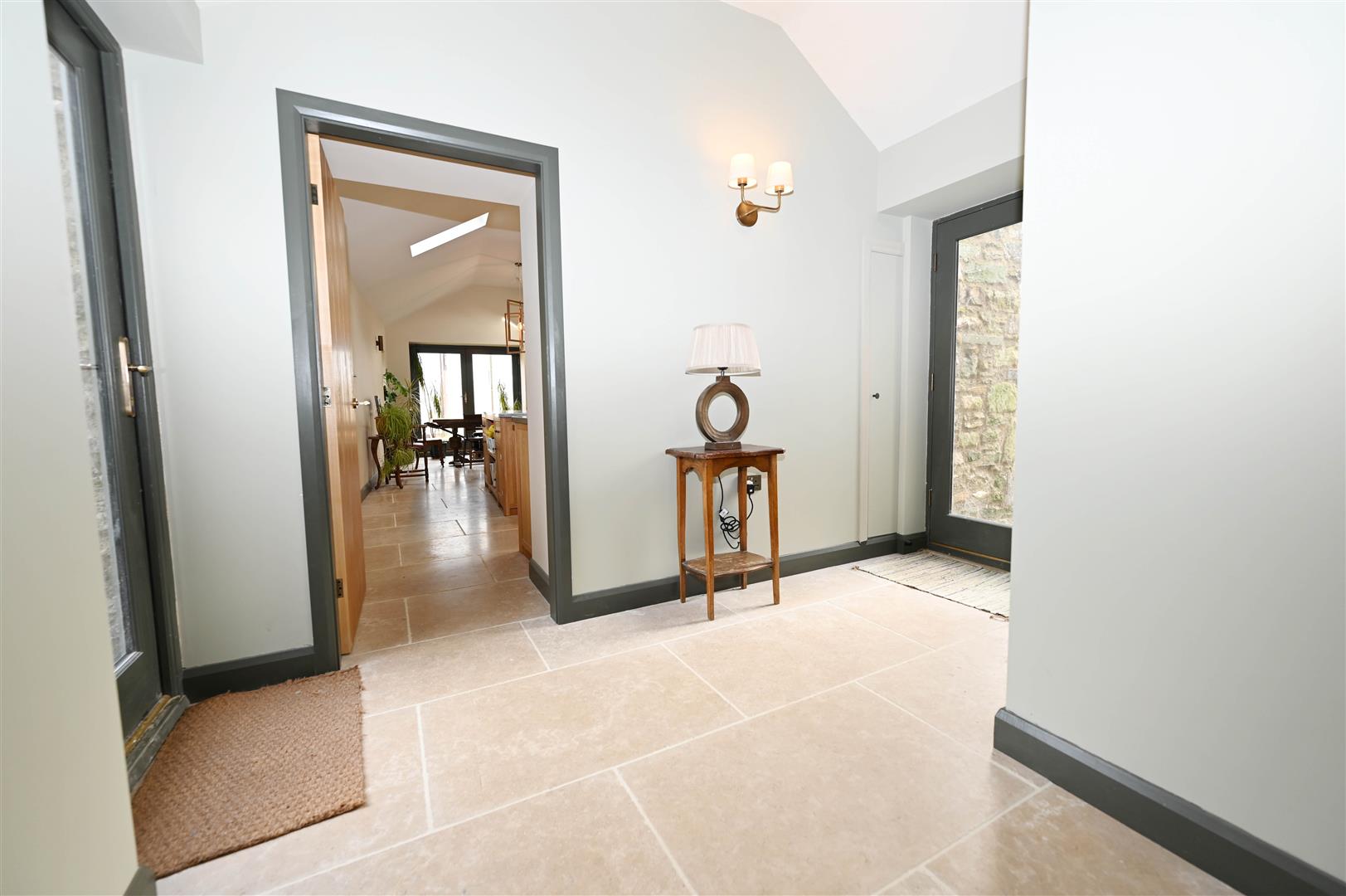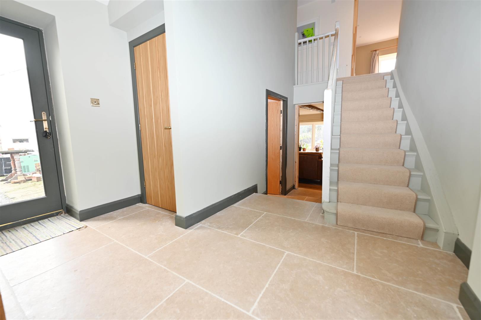 An eye-catching open space with Limestone flooring (Under-floor heating) & coats cupboard. Staircase to first floor, double-glazed doors to outside & steps to: