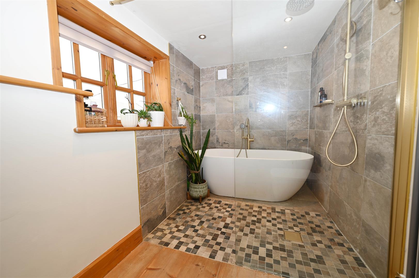 Lovely – comprising wash area with vanity unit & WC, & ‘Wet’ area with free-standing oval bath & separate twin-head shower set behind a glazed screen. Tile & Pine flooring, down-lighting & recessed double-glazed windows to rear.