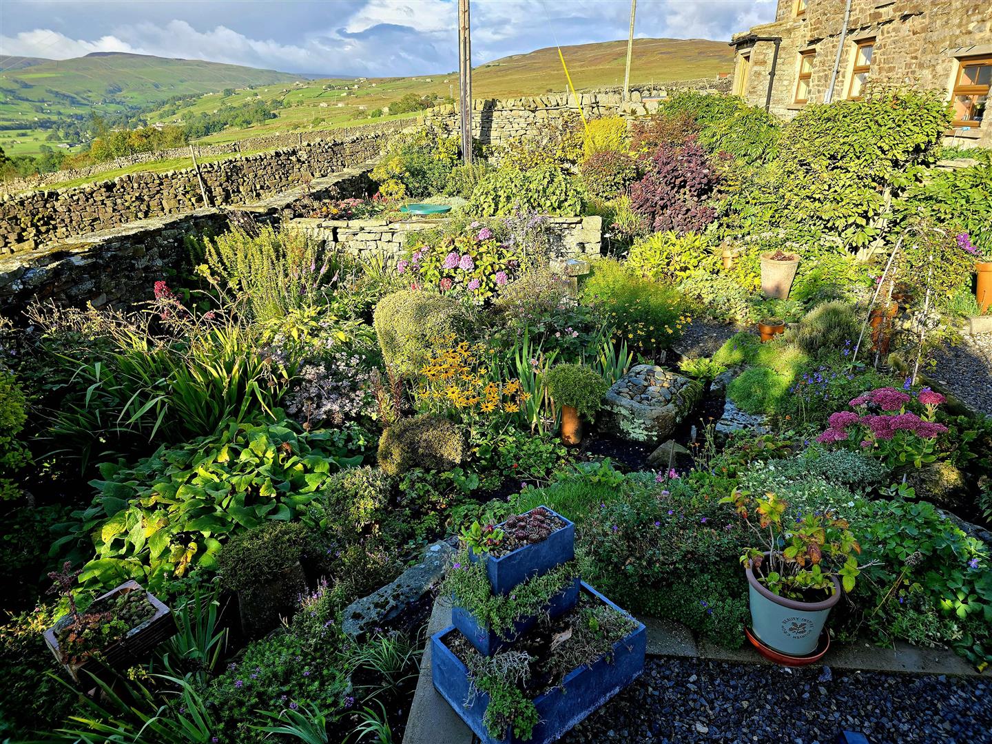 South facing with STUNNING VIEWS & planted with a profusion of flowers & shrubs creating a rainbow of colour. Pathway lighting, outside lighting & cold-water tap.