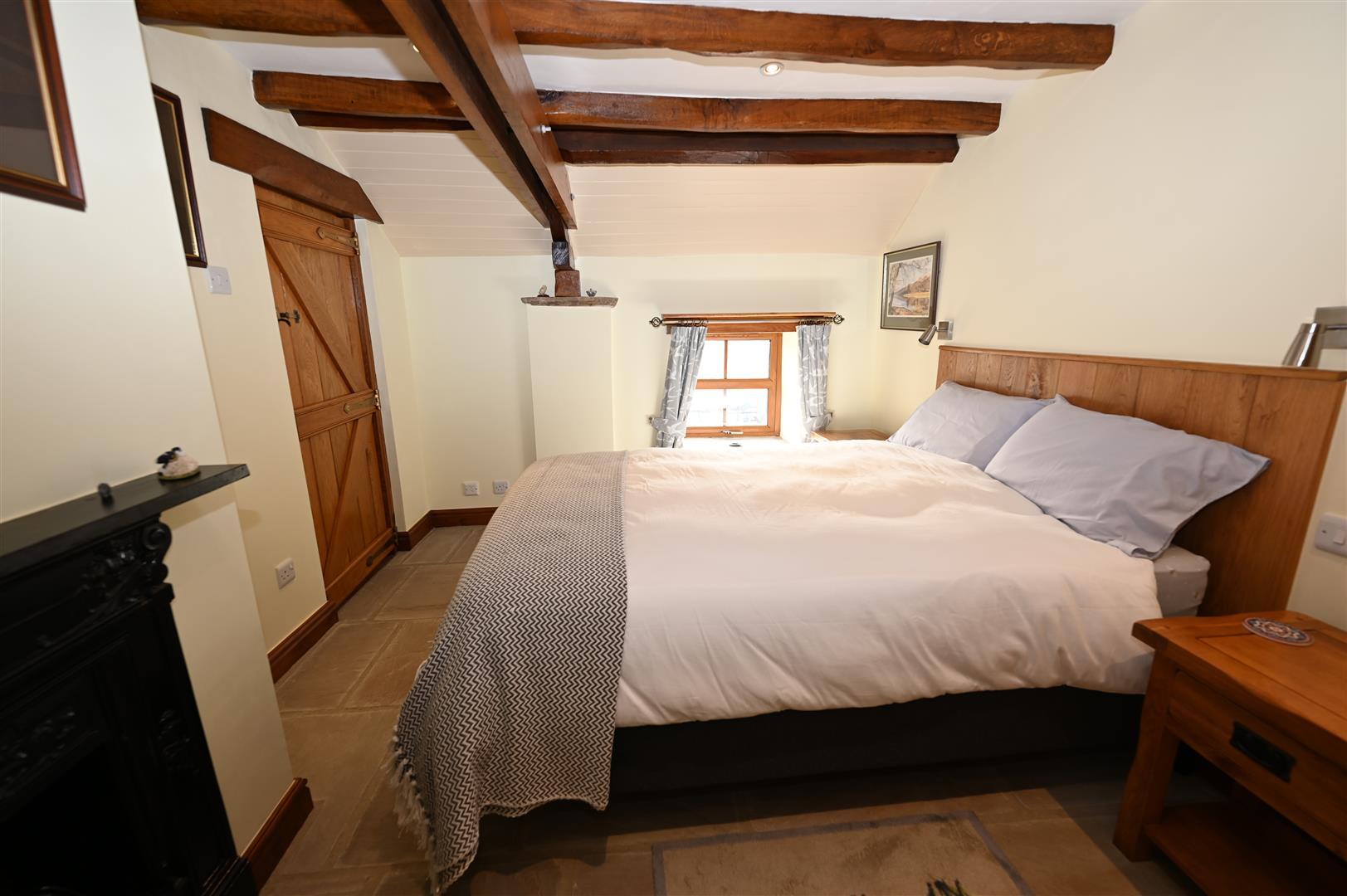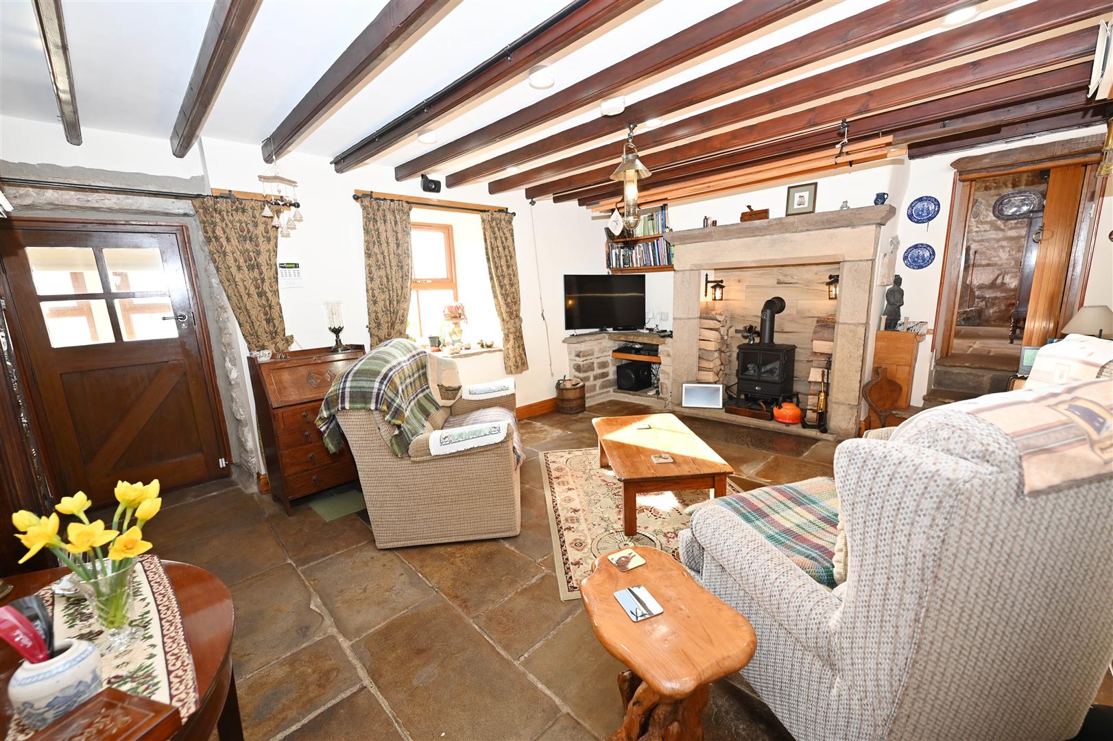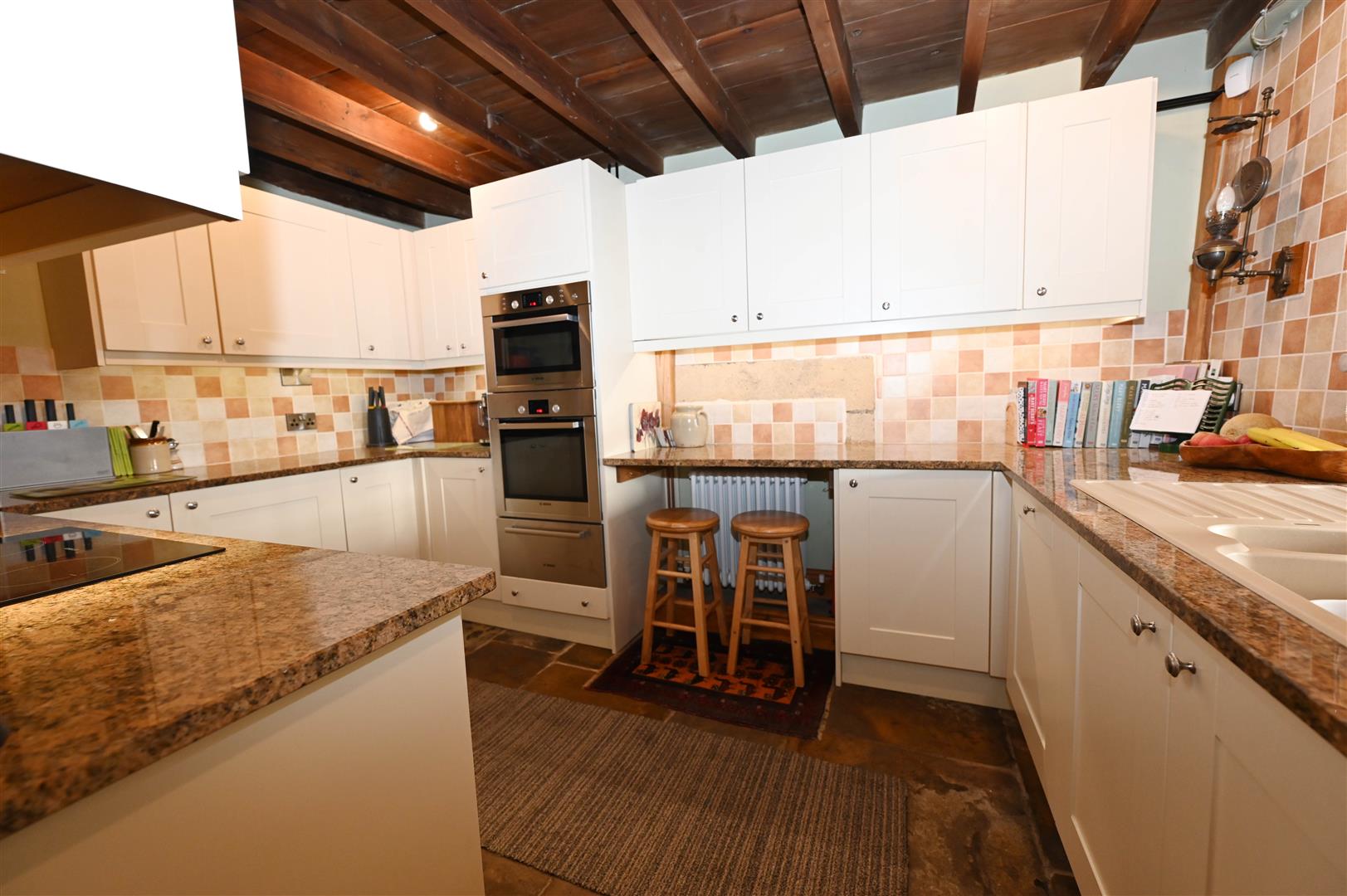 Stone floor & beamed ceiling, feature cast fire surround, exposed stone wall with nook, built-in cupboard.