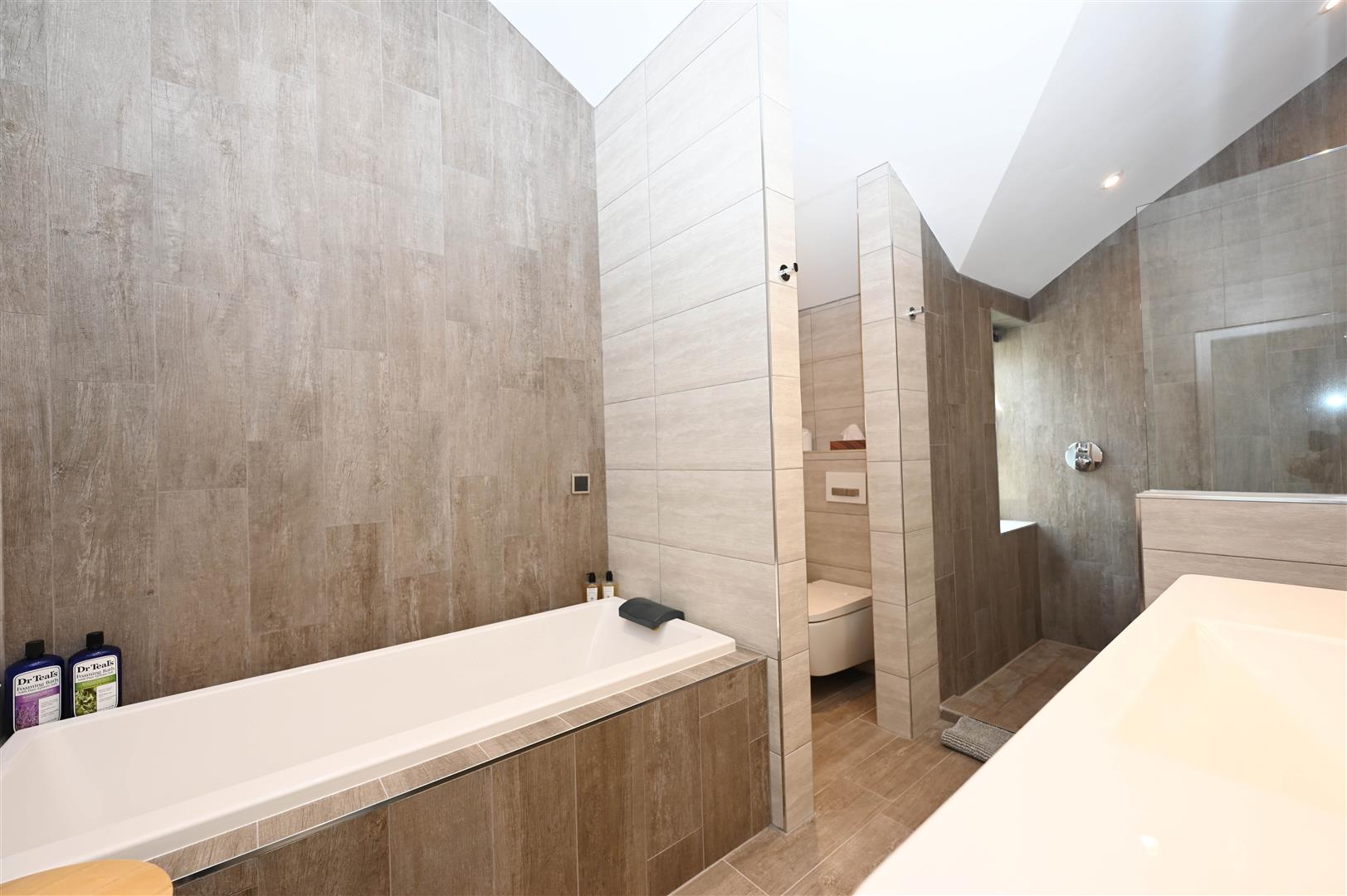 Level shower area, panelled bath, washbasin with cupboard & WC.