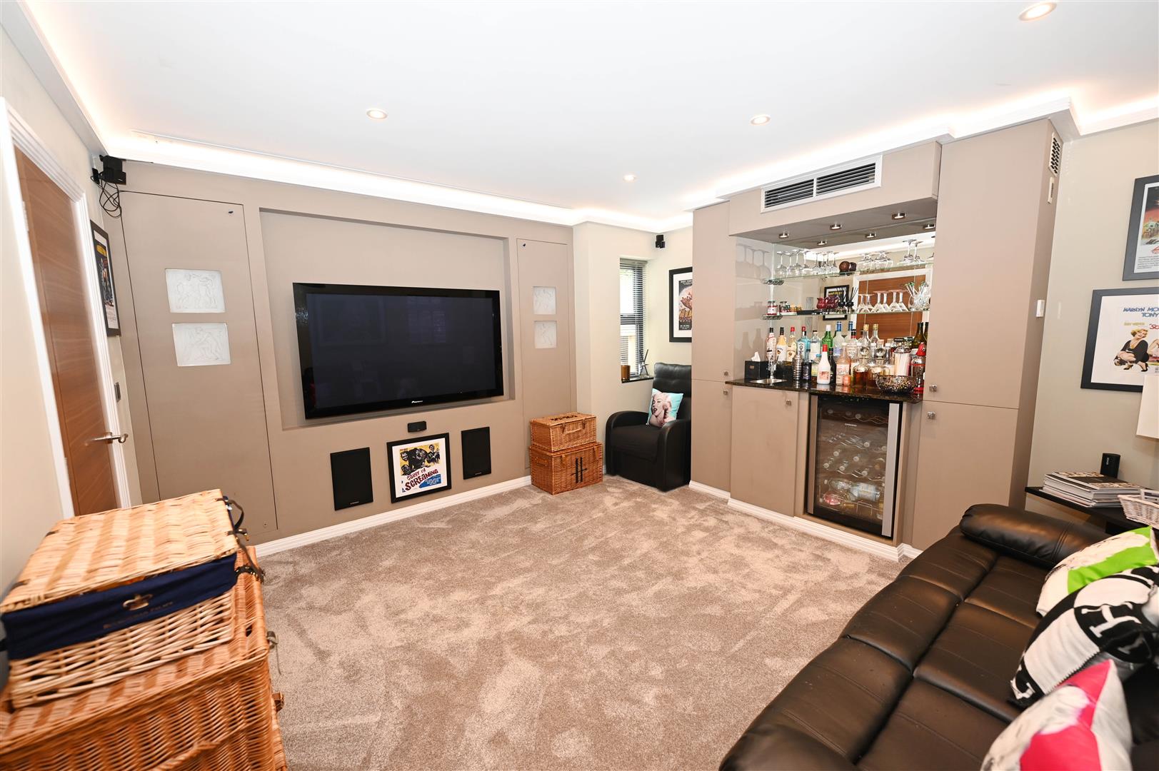 An air-conditioned room with movie projector & screen, Bose surround sound & Sonos bar. Inset Granite bar unit with fridge & storage.