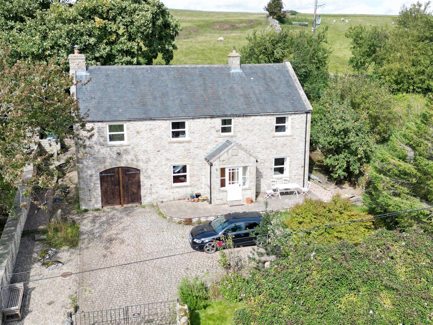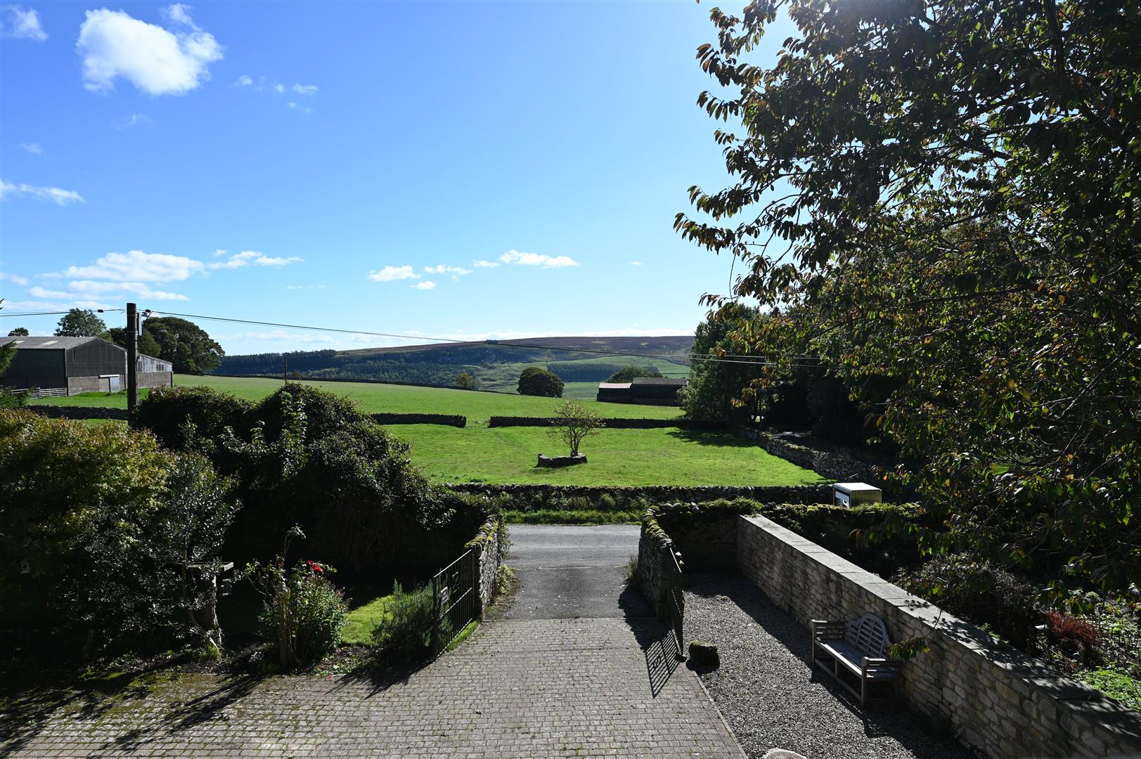 Stone boundary wall with twin gates to brick sett drive & hard-standing area for several cars. South facing lawn with flower/shrub planting & gravelled area. Access either side to rear garden area with small stone OUTBUILDING. Views over open grazing land to the rear.