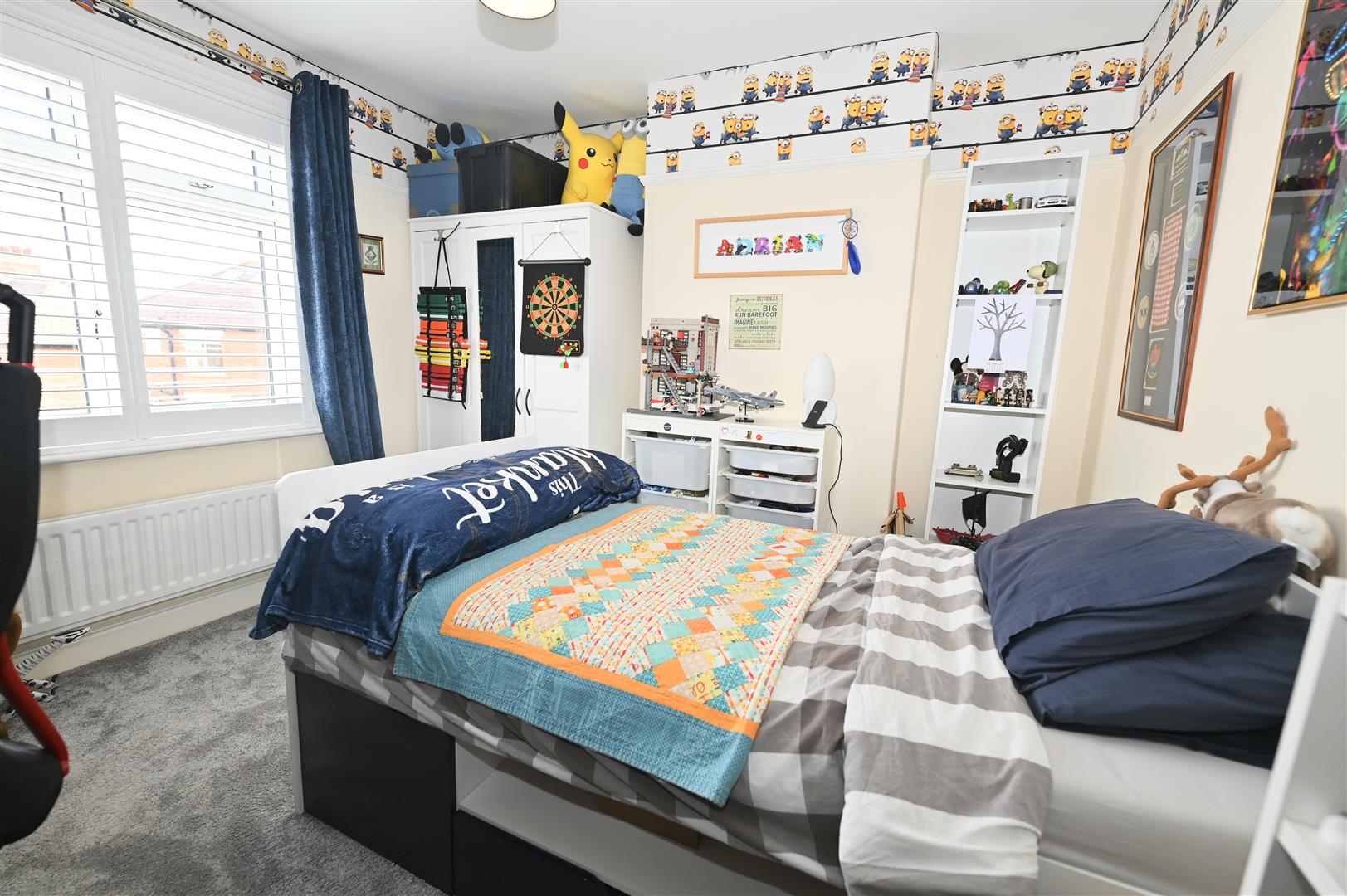A double bedroom with a central heating radiator and a UPVC double glazed window to front with plantation shutters.