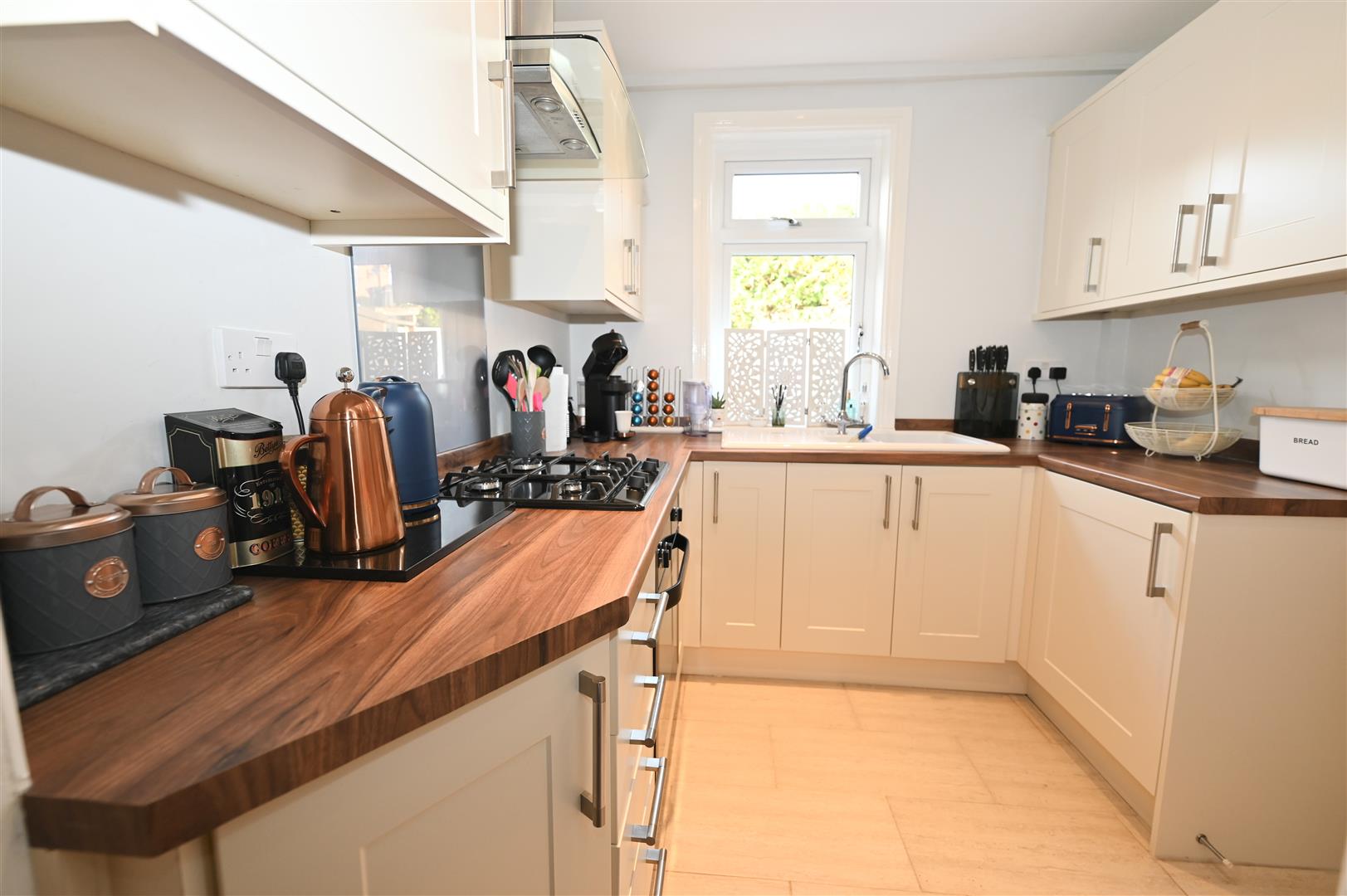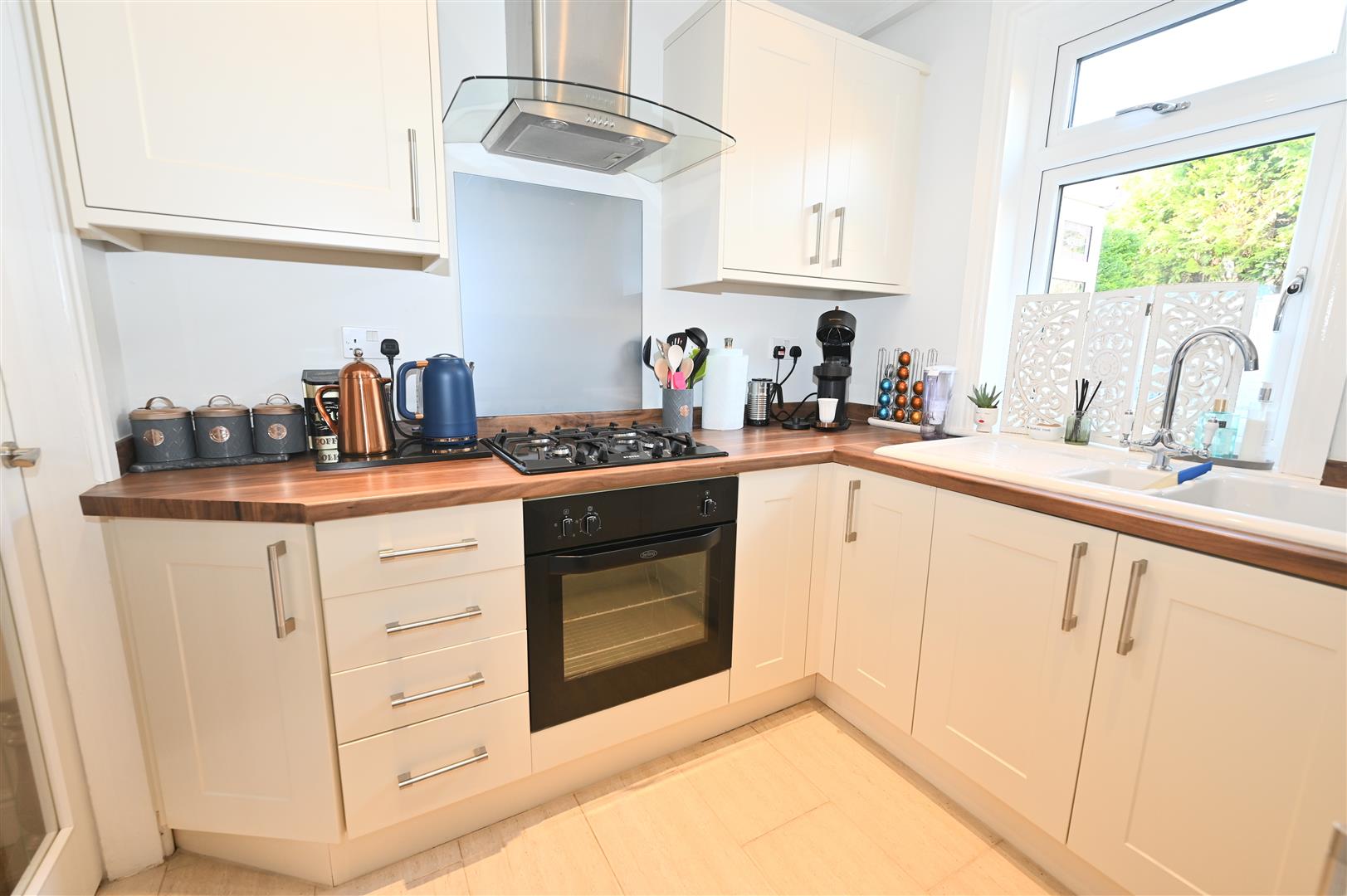 At the rear of the property having a range of wall, base and drawer units with wooden effect worktops and upstands, electric oven, gas hob, stainless steel extractor hood, one and a half bowl ceramic sink unit with mixer tap over, tiled flooring and spot lights. A door leads into the utility room.
