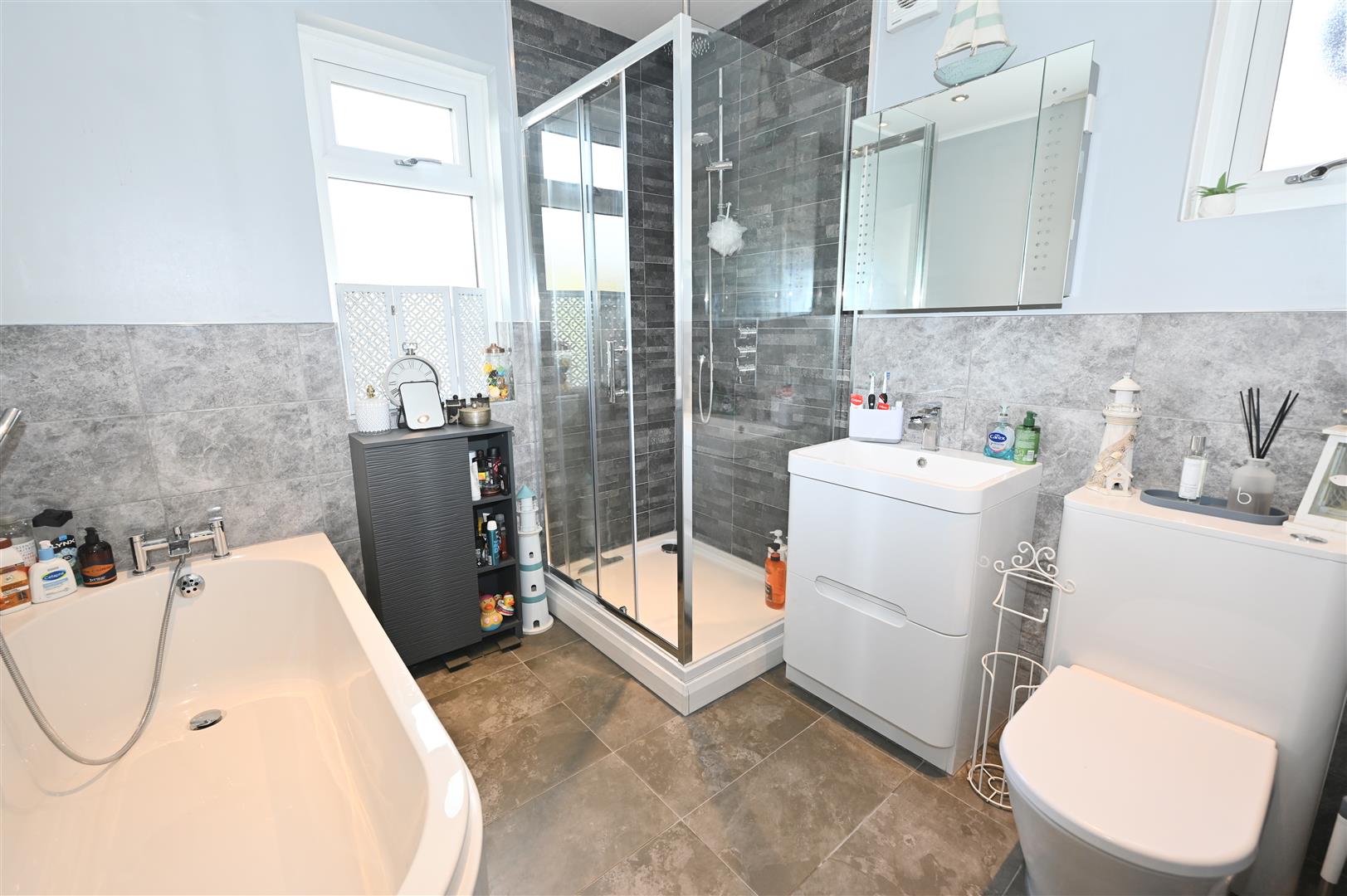 With a white suite comprising of bath with shower tap over, separate shower cubicle, w.c, wash hand basin with a vanity drawer unit beneath. part tiled walls, extractor fan, UPVC double glazed window.