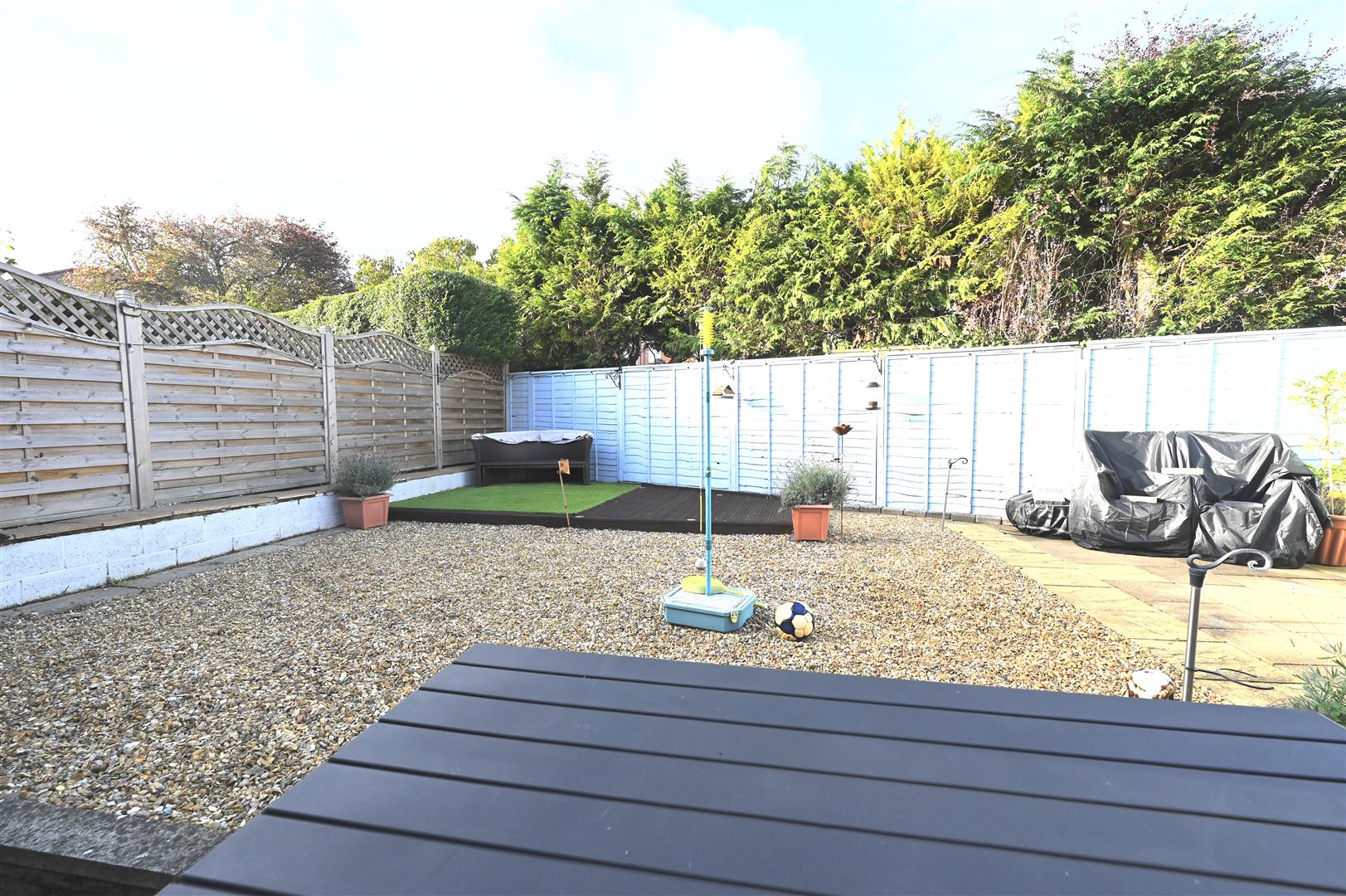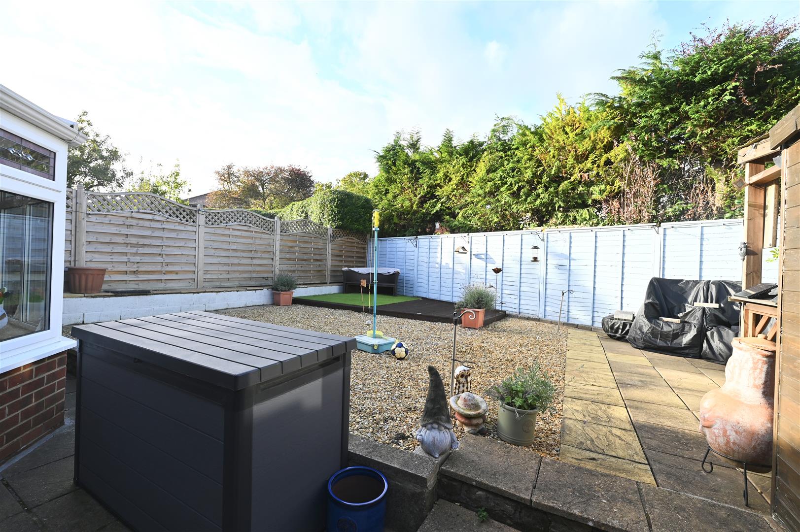 Gravel, decked & flagged areas with raised border, timber shed and a an external cold water tap and security light to the side.