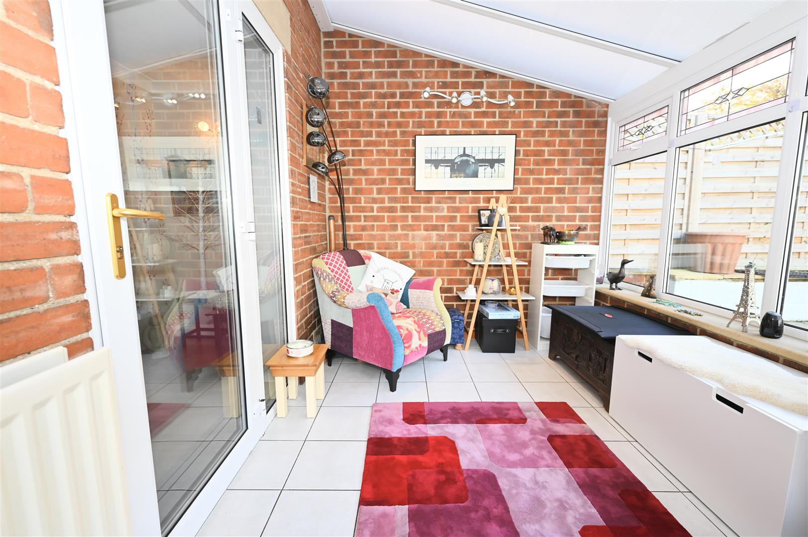 Tiled floor, two wall lights, central heating radiator, UPVC double glazed windows, coving and door leading out to the rear garden.