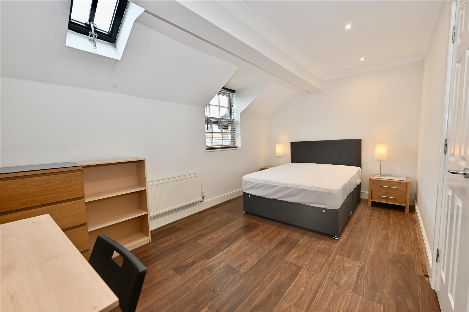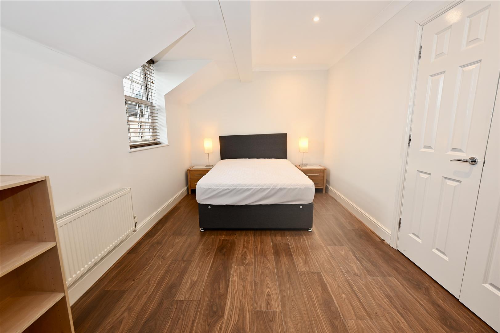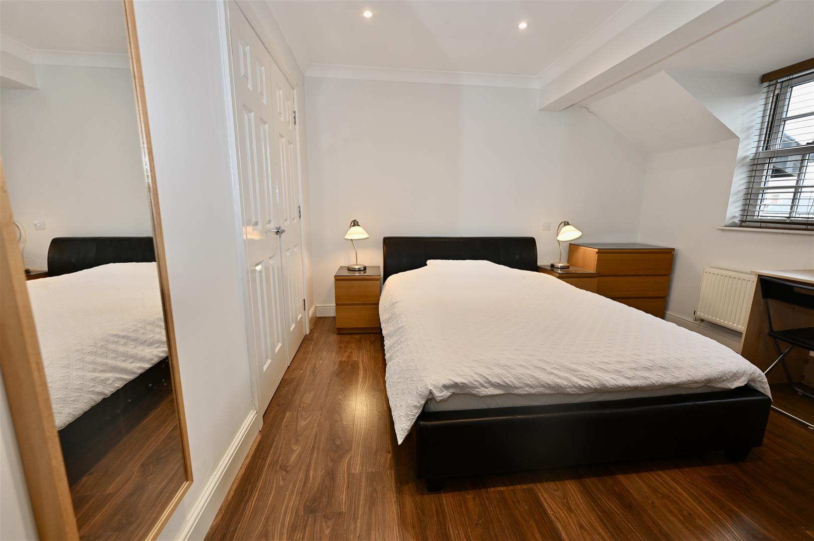 A double bedroom, South facing with two double glazed sliding sash windows, wooden effect flooring, two wardrobes with integral lighting, ceiling spotlights, central heating radiator.