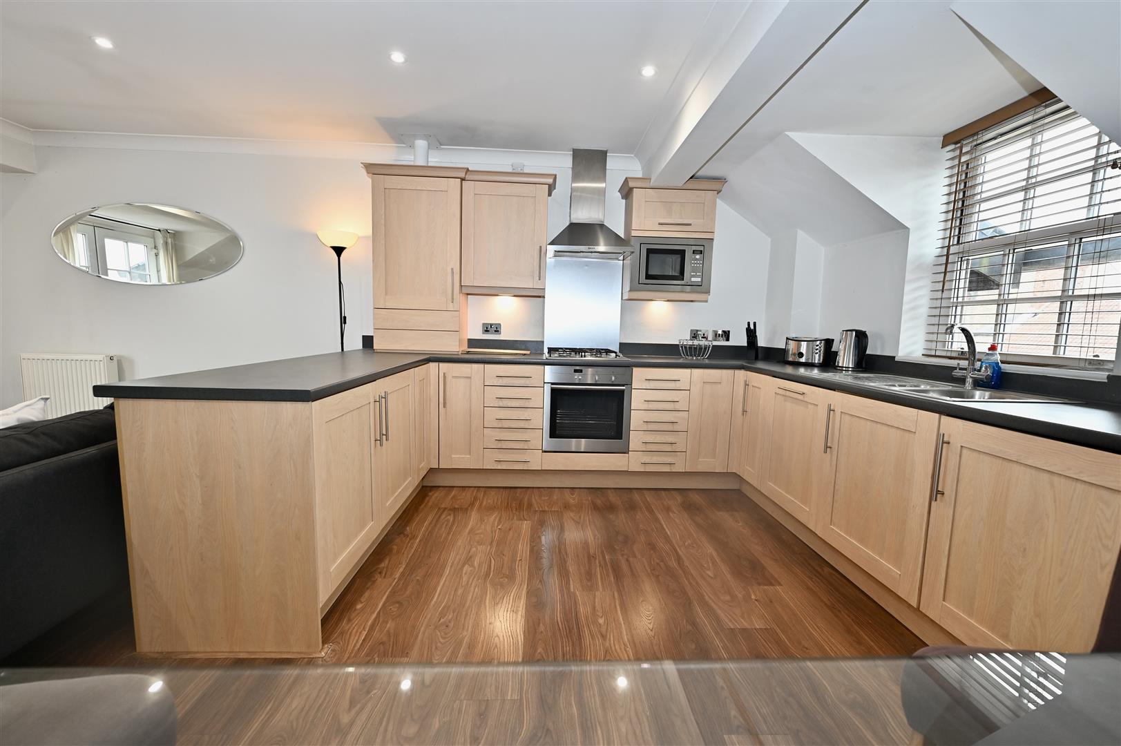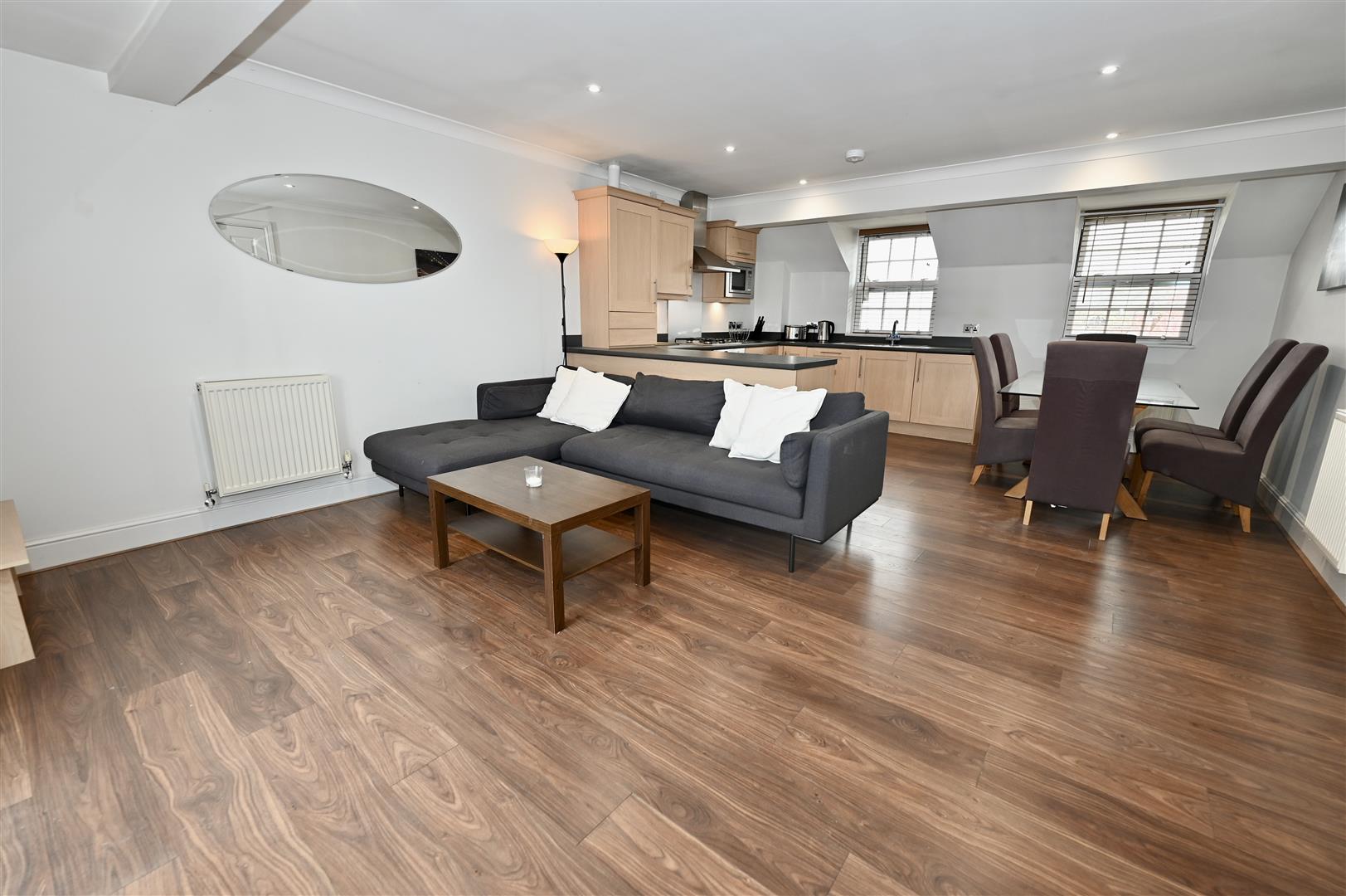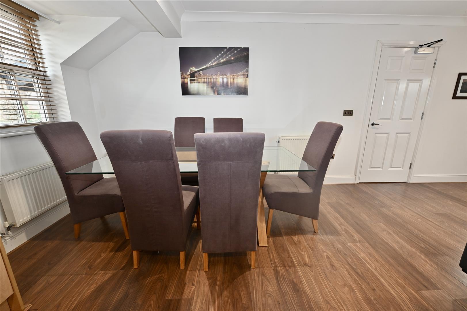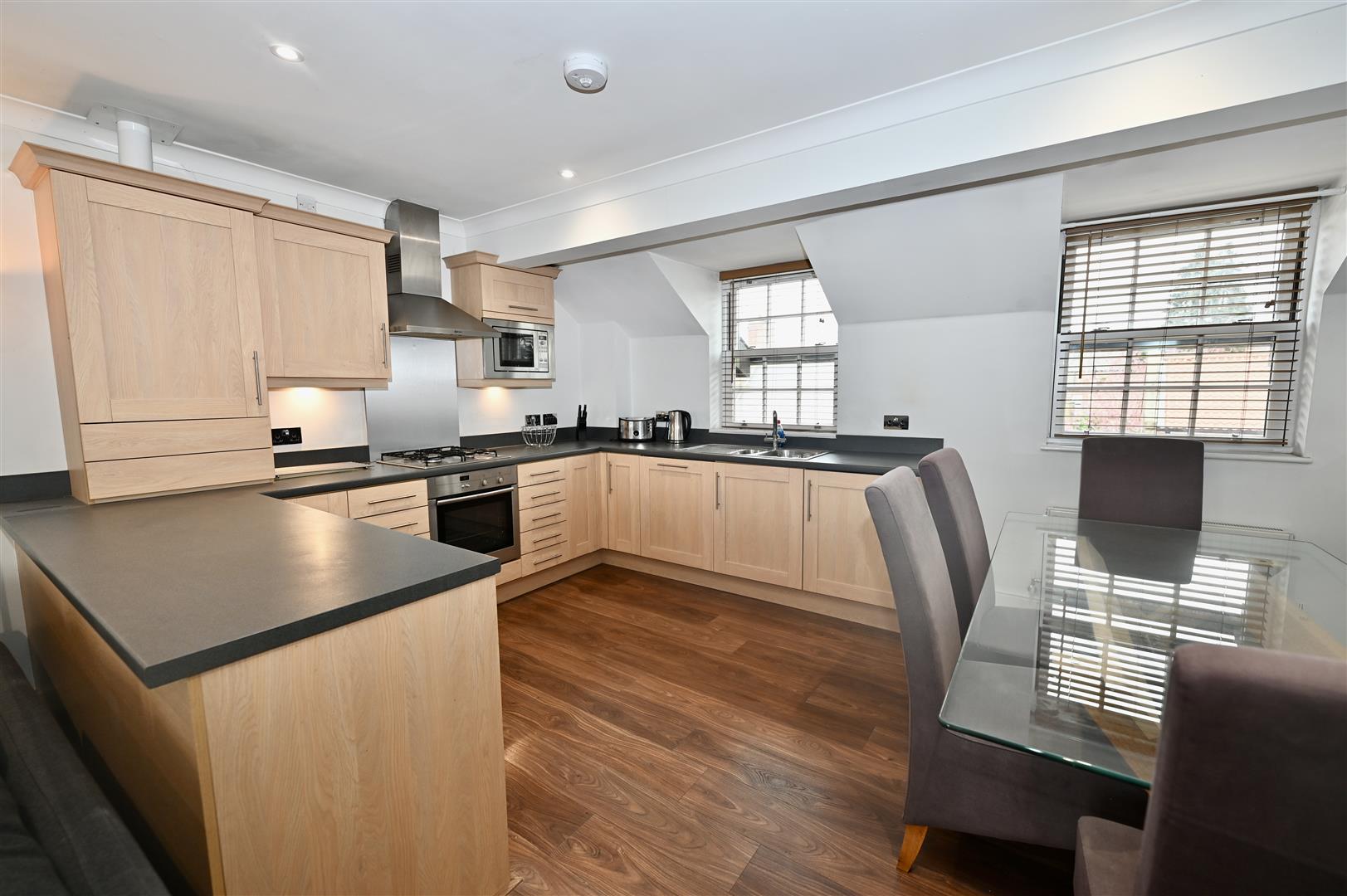 Fitted with a stylish range of quality light oak wall, base and drawer units, with dark contrasting work surfaces, matching splashbacks, NEFF kitchen appliances, including integrated fridge, integrated freezer, integrated microwave, electric oven, gas hob and stainless steel extractor hood. There is also an integrated dishwasher and an integrated washing machine. One and a half bowl stainless sink unit with mixer tap, wooden effect flooring, ceiling spotlights, concealed Main Combination Boiler. Spacious dining area within the open plan layout.