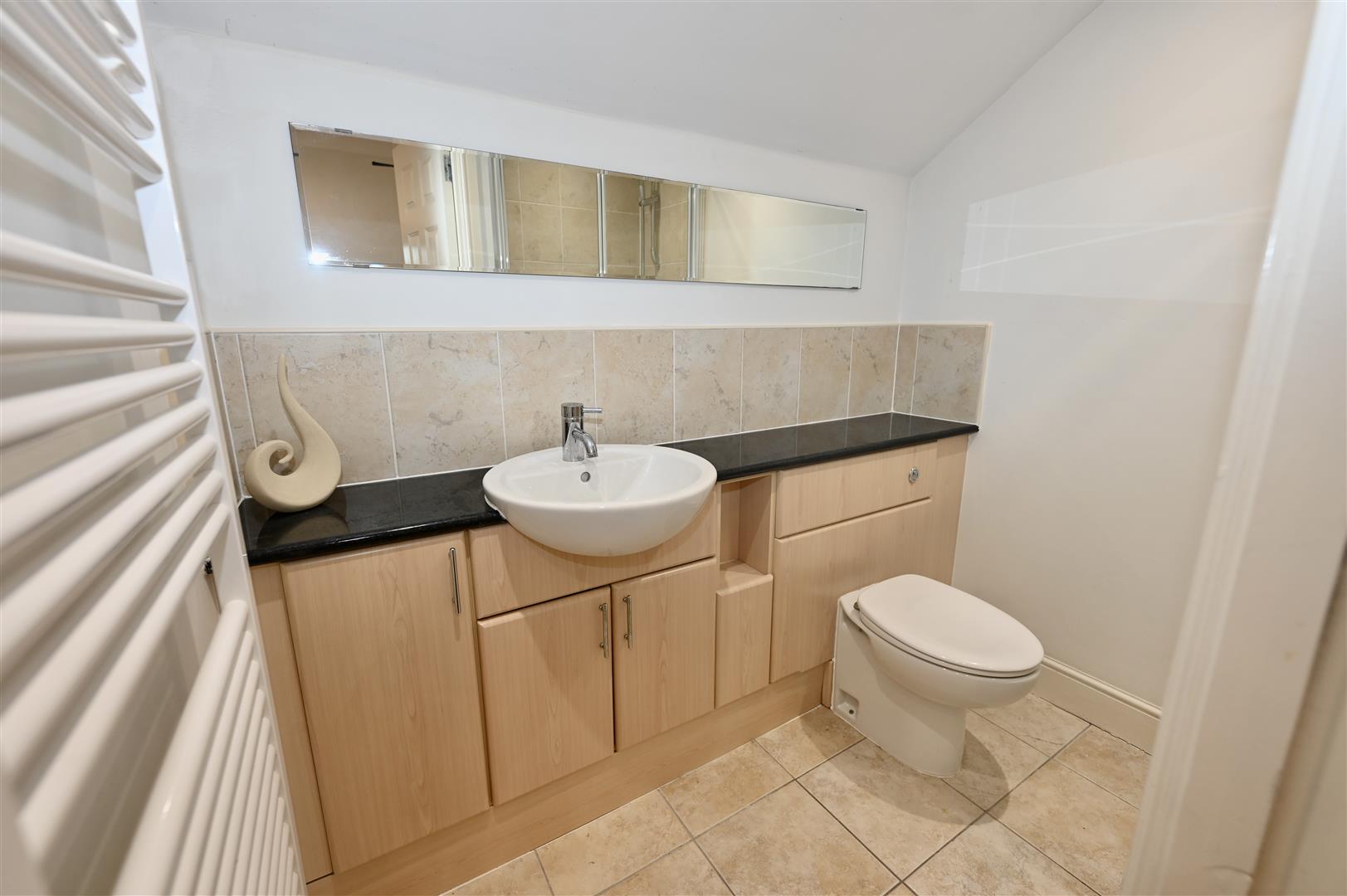 Double shower cubicle, (the shower can be controlled from the bedroom), low level wc, wash basin with fitted cupboard below, heated towel rail, part tiled walls, tiled flooring, ceiling spotlights.