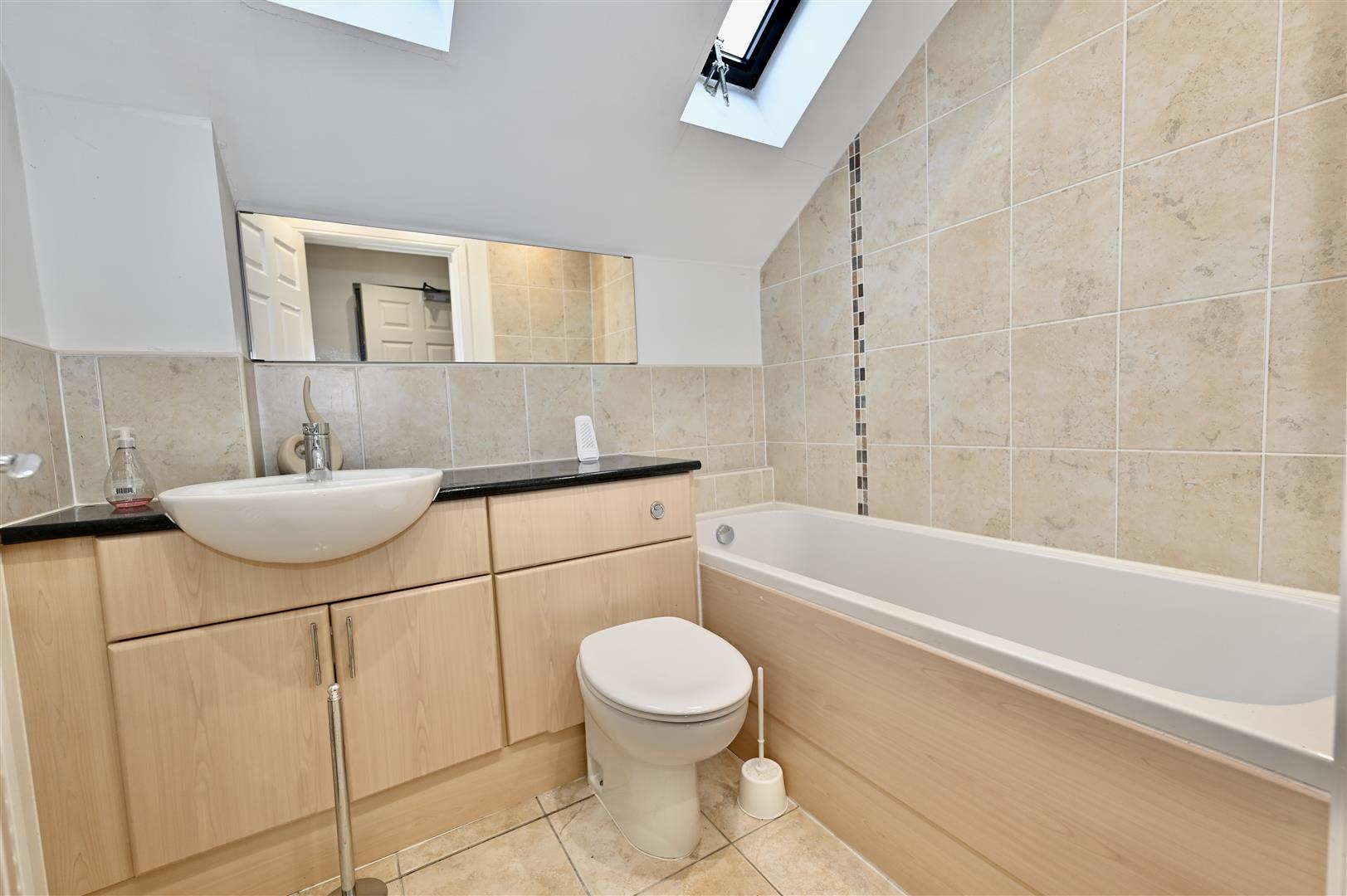 Bathroom with white suite comprising a modern stylish bath, wc and handbasin with fitted cupboard below, tiled floor and part tiled walls, ceiling spotlights and towel dryer. Velux roof window.