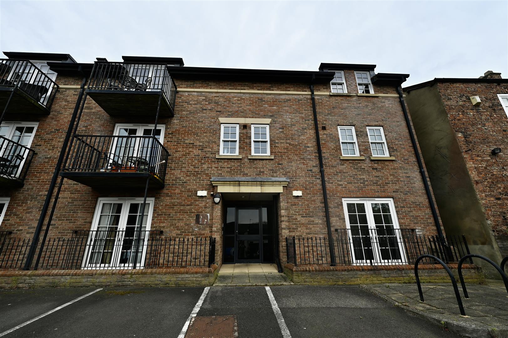 A double bedroom with views over Coniscliffe Road, sliding sash window, wooden effect flooring, two wardrobes with integral lighting, ceiling spotlights and a central heating radiator