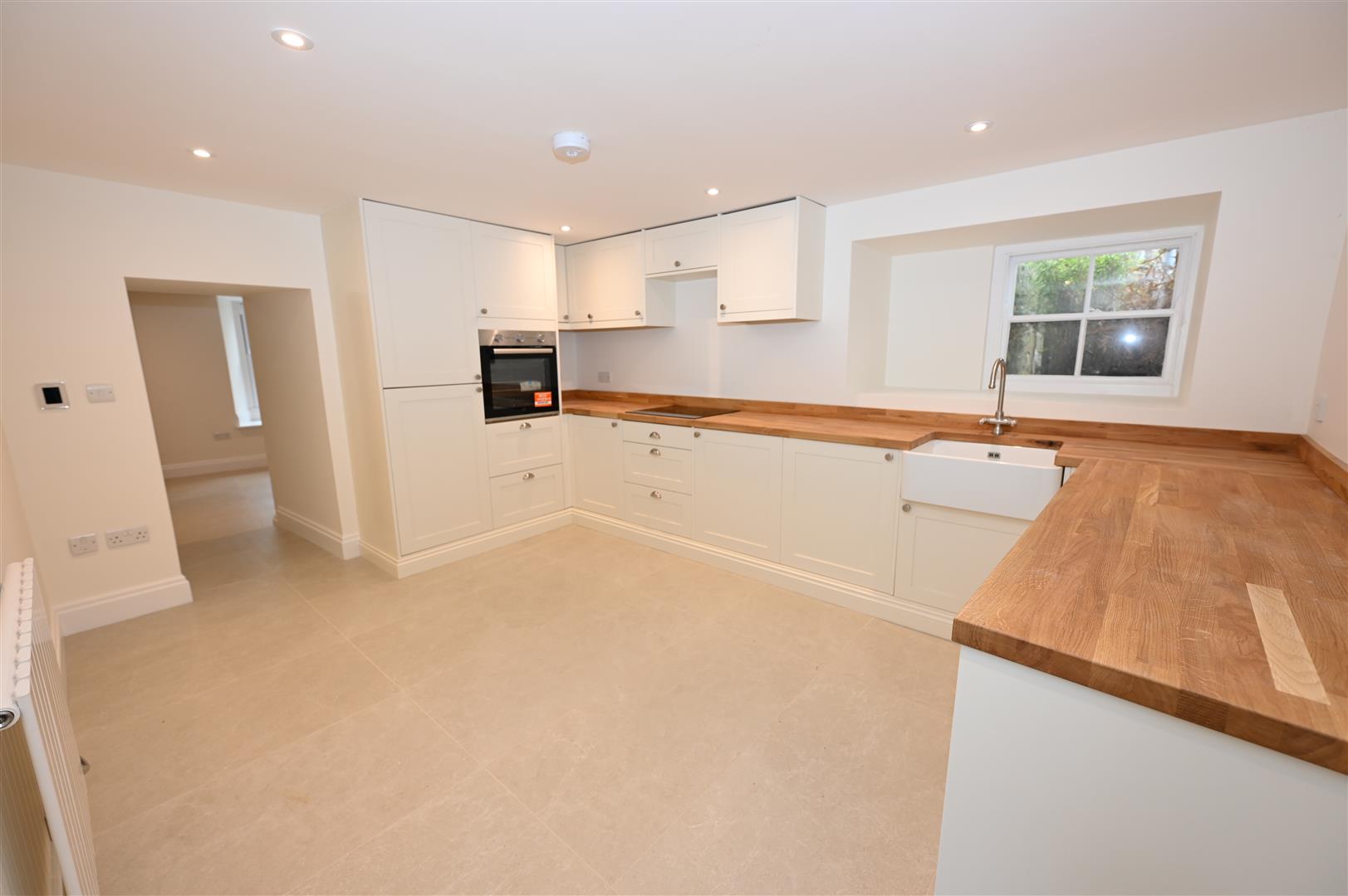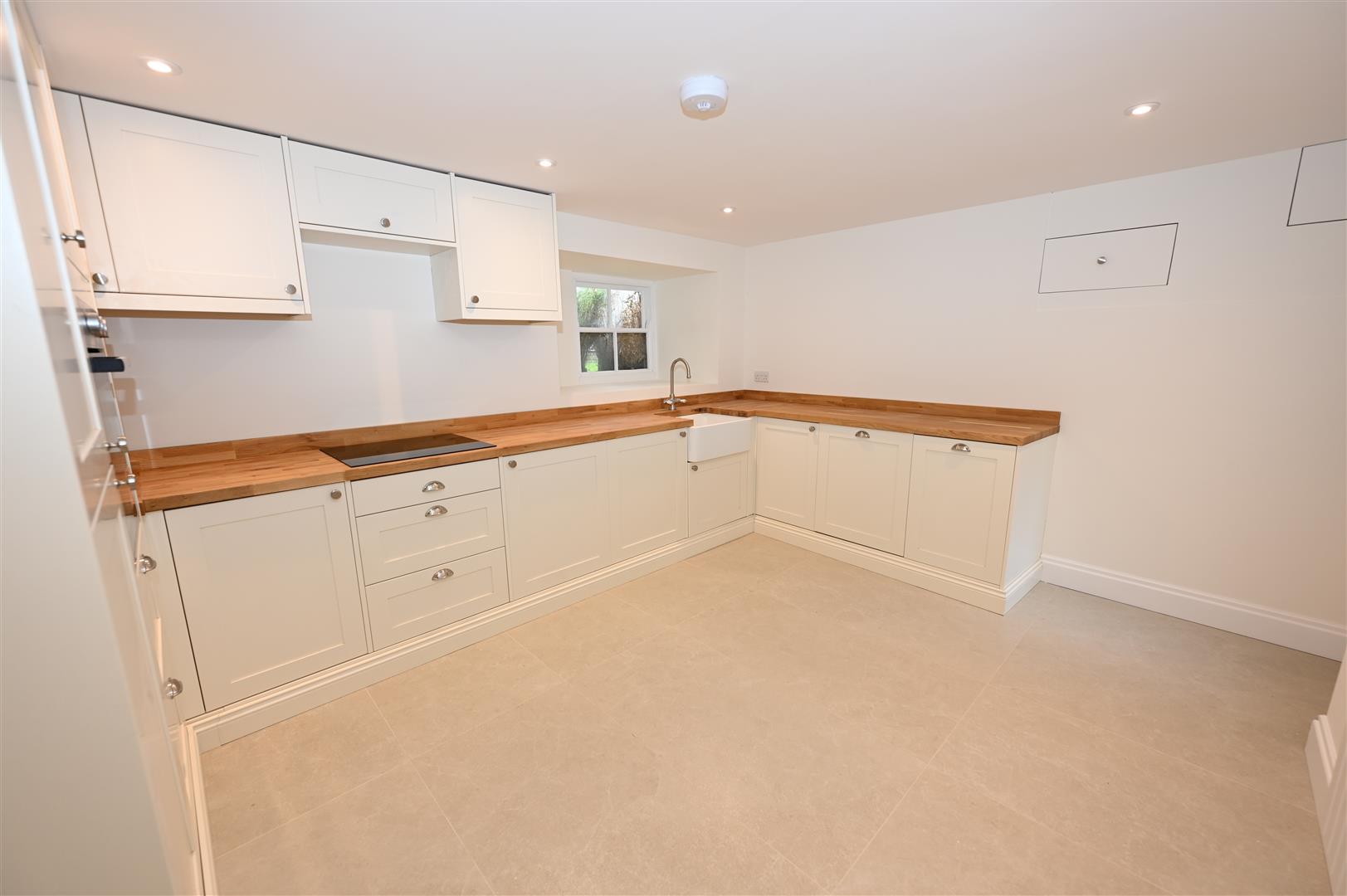 At the rear of the property with a range of wall, base and drawer units with wooden effect worktops and up stands , Beko electric oven, electric hob with extractor hood over, integrated dishwasher, integrated washing machine, ceramic Belfast sink unit with mixer tap over, tiled flooring with underfloor heating, electric radiator, chamfered window to the side and a composite double glazed door to the rear.