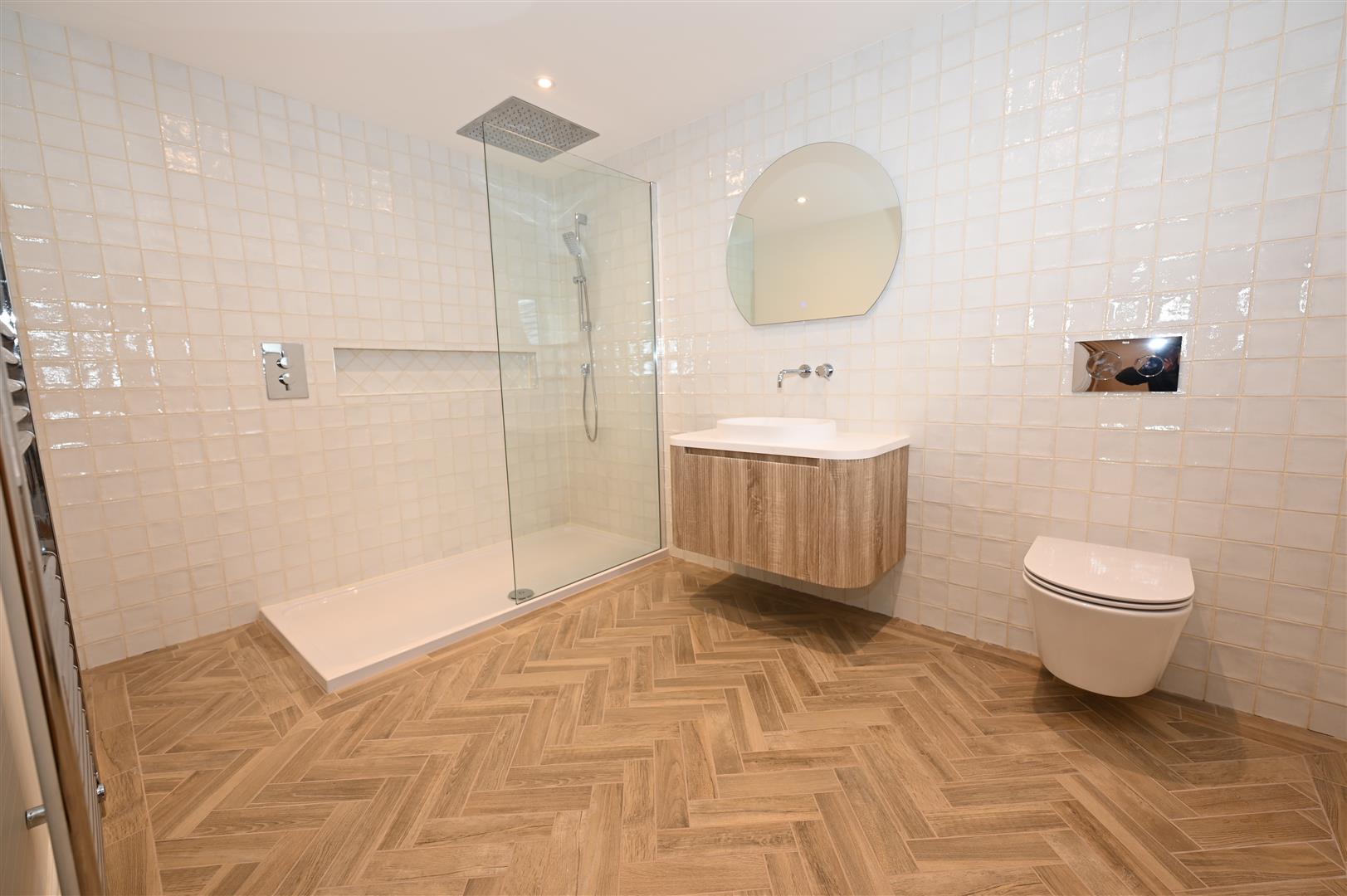 A generous sized shower room with a double shower cubicle, w.c, wash hand basin with a vanity cupboard beneath, tiled walls, bathroom mirror, heated electric towel radiator and herringbone wooden effect tiled flooring.