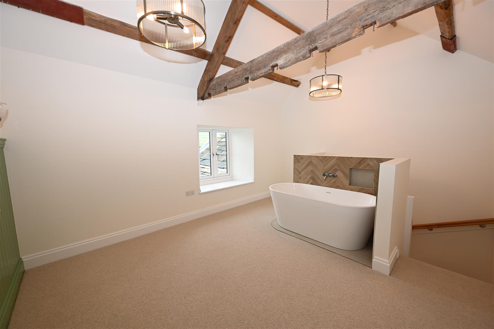 An impressive master suite with exposed ceiling beams, feature panelled wall, two wall lights, free standing bath with herringbone tiled splash back, there is a window to the rear and an electric radiator.